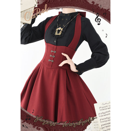Plaid Strap Skirt, Tailored Vest, and Pleated Blouse with Persimmon Cat and Bouquet