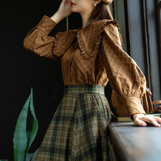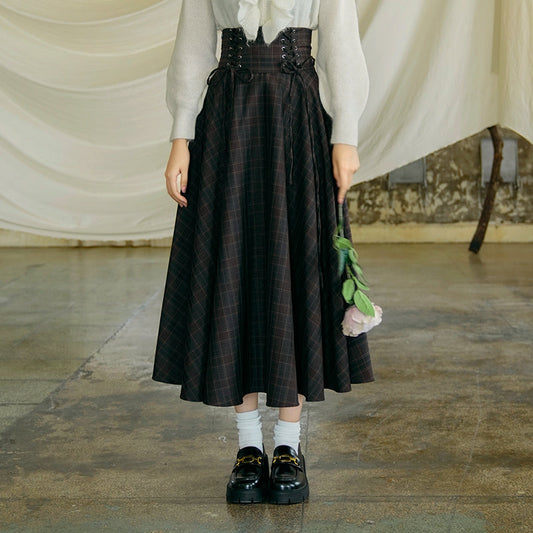 Sold outVendor:Miss EggDark brown plaid lace-up flare skirt