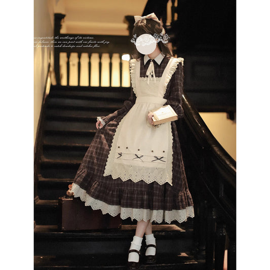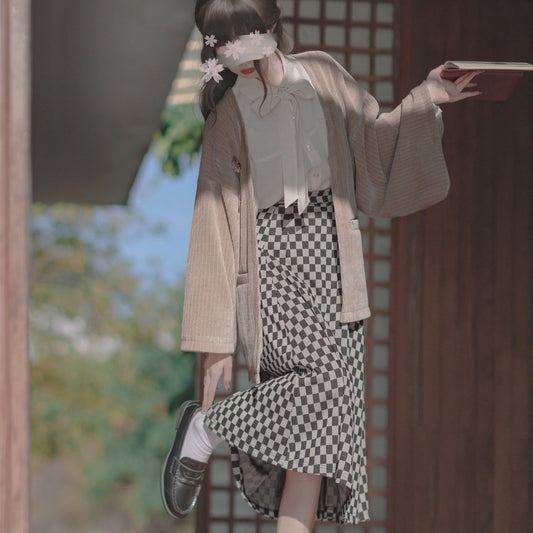Plaid Strap Skirt, Tailored Vest, and Pleated Blouse with Persimmon Cat and Bouquet