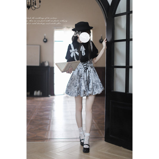 Black Ink Plaid Short Jumper Skirt and Blouse
