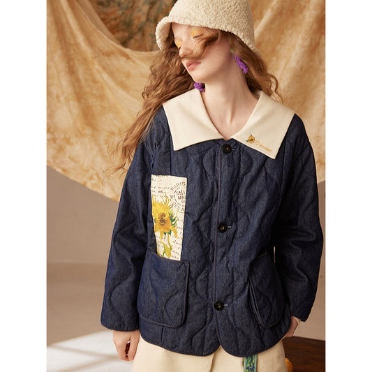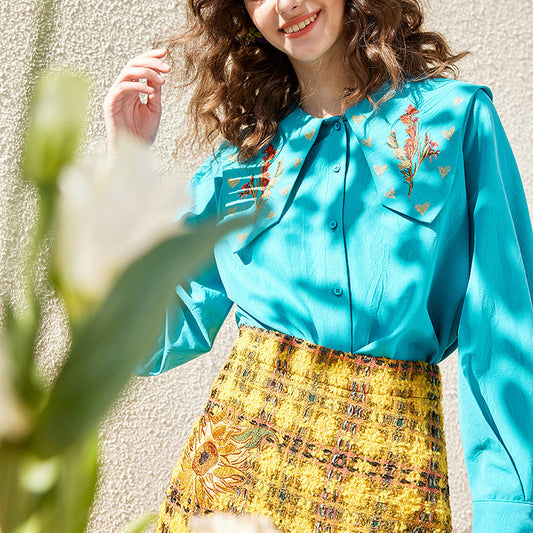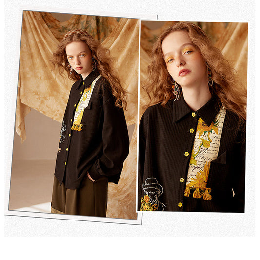 Vase sunflower embroidery patchwork blouse