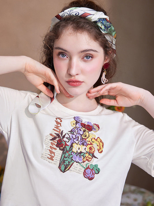 Japanese vase embroidery T-shirt with roses and anemones