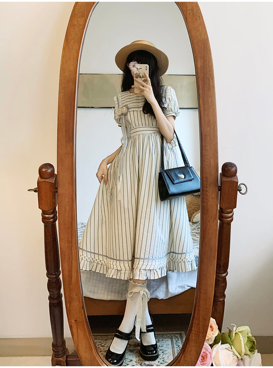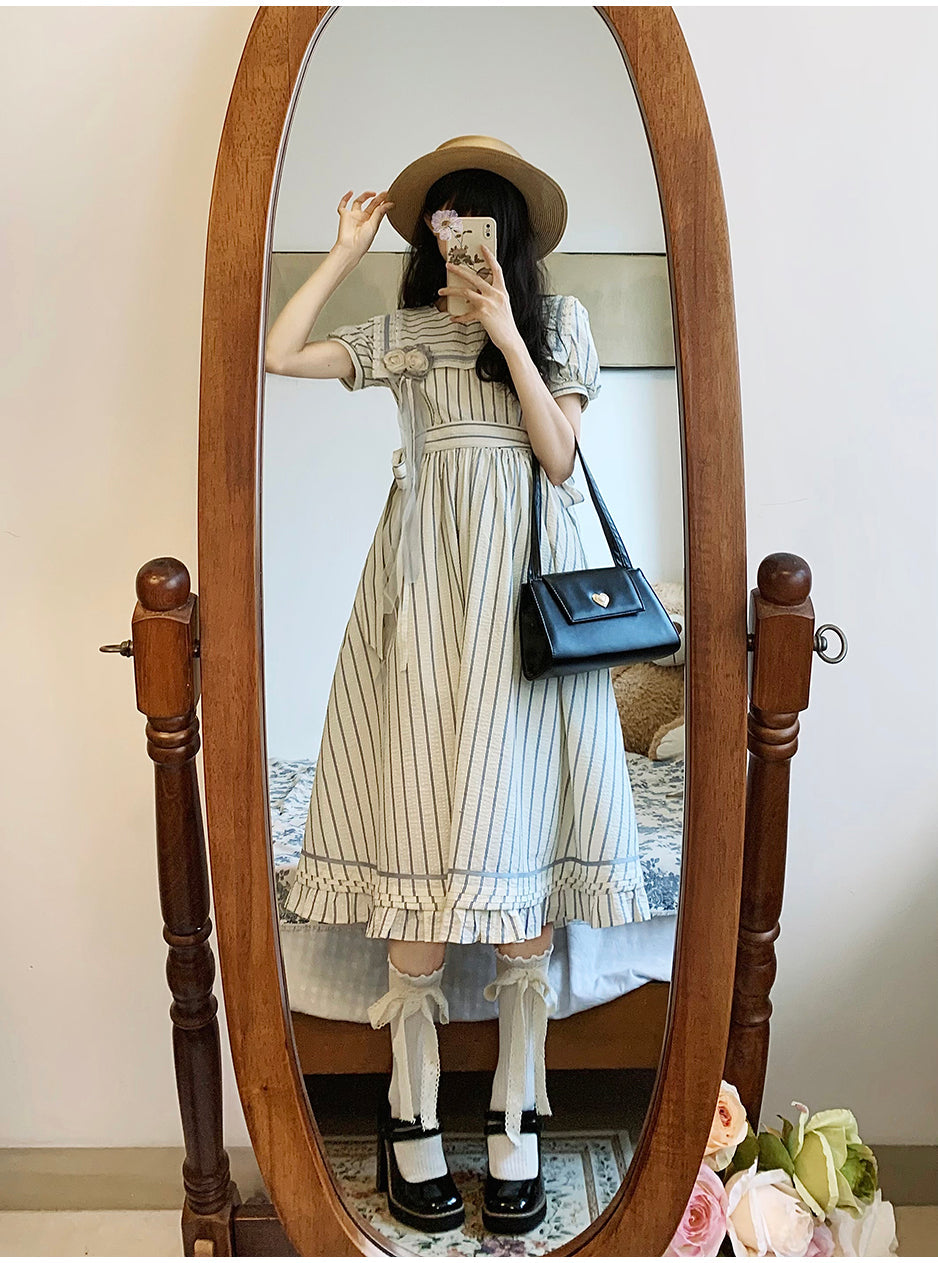 A dress for girls who have garden parties on sunny days. The striped fabric has a sailor design, and it is cute even from the back. You can almost hear the girls laughing as they teach each other their favorite literature while enjoying tea and scones.
