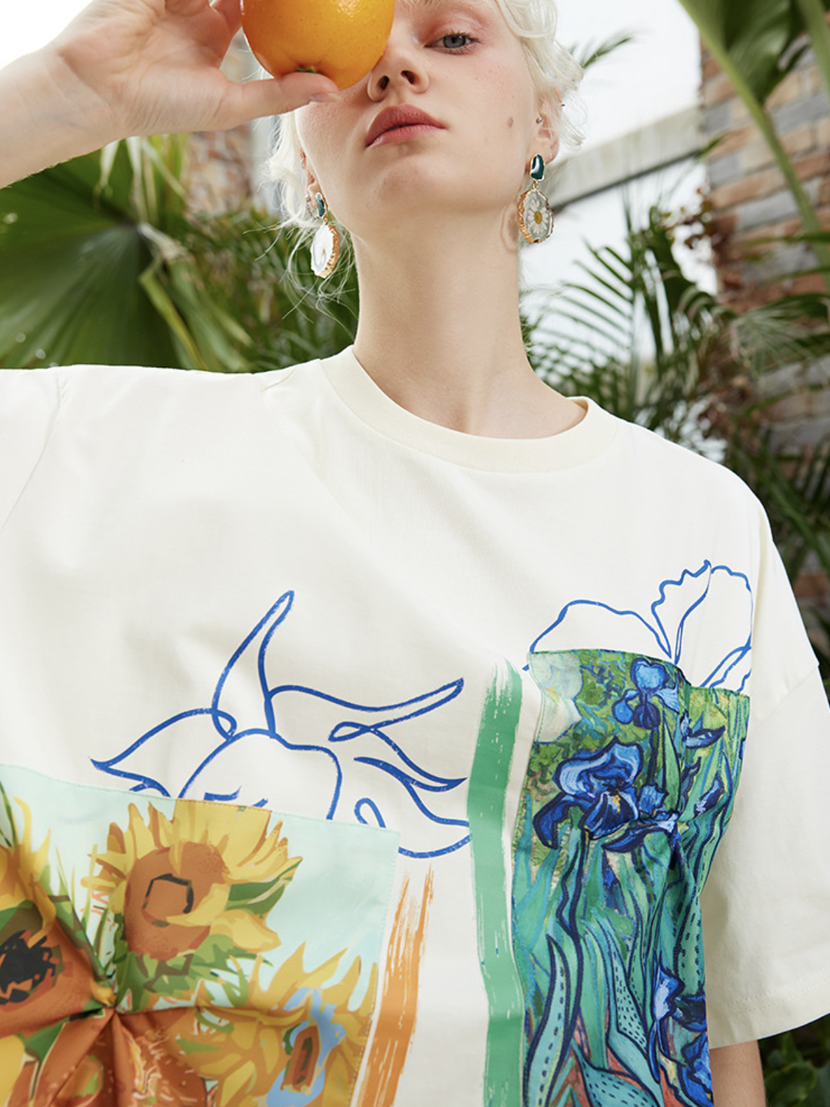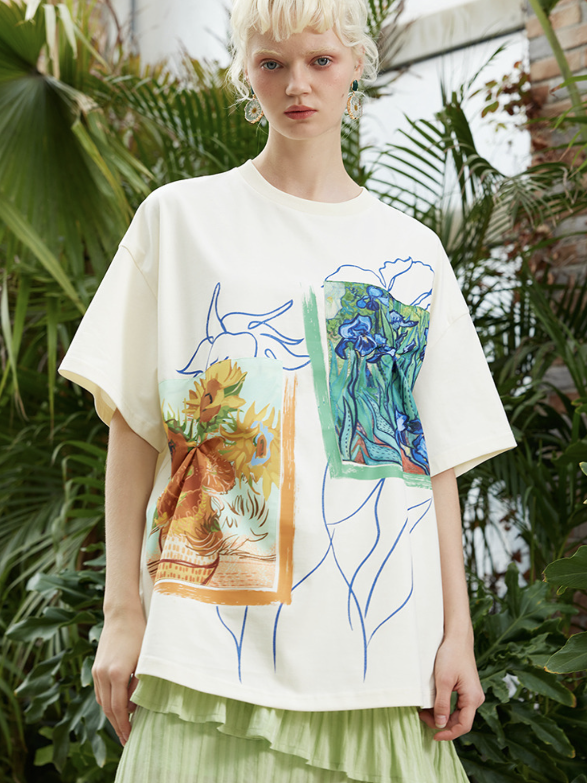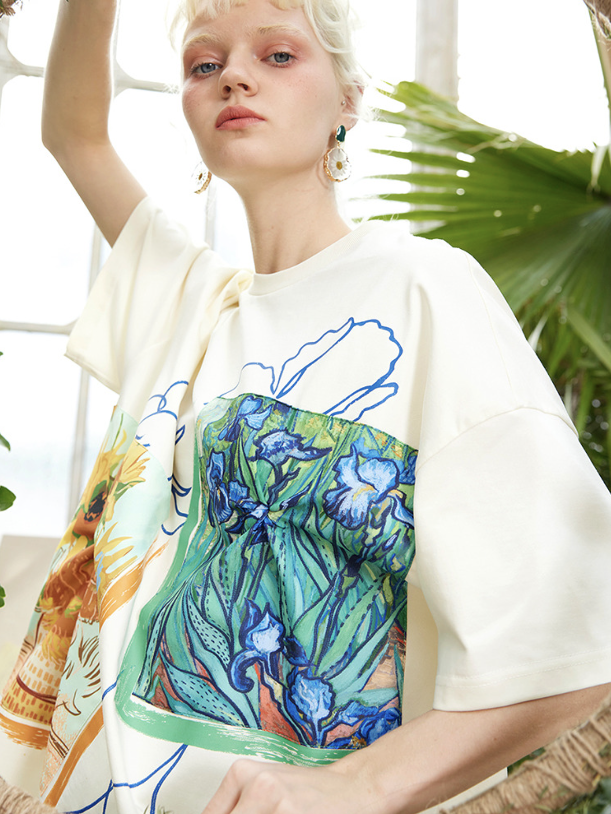 A T-shirt featuring Van Gogh's "Sunflowers in a Vase" and "Iris".