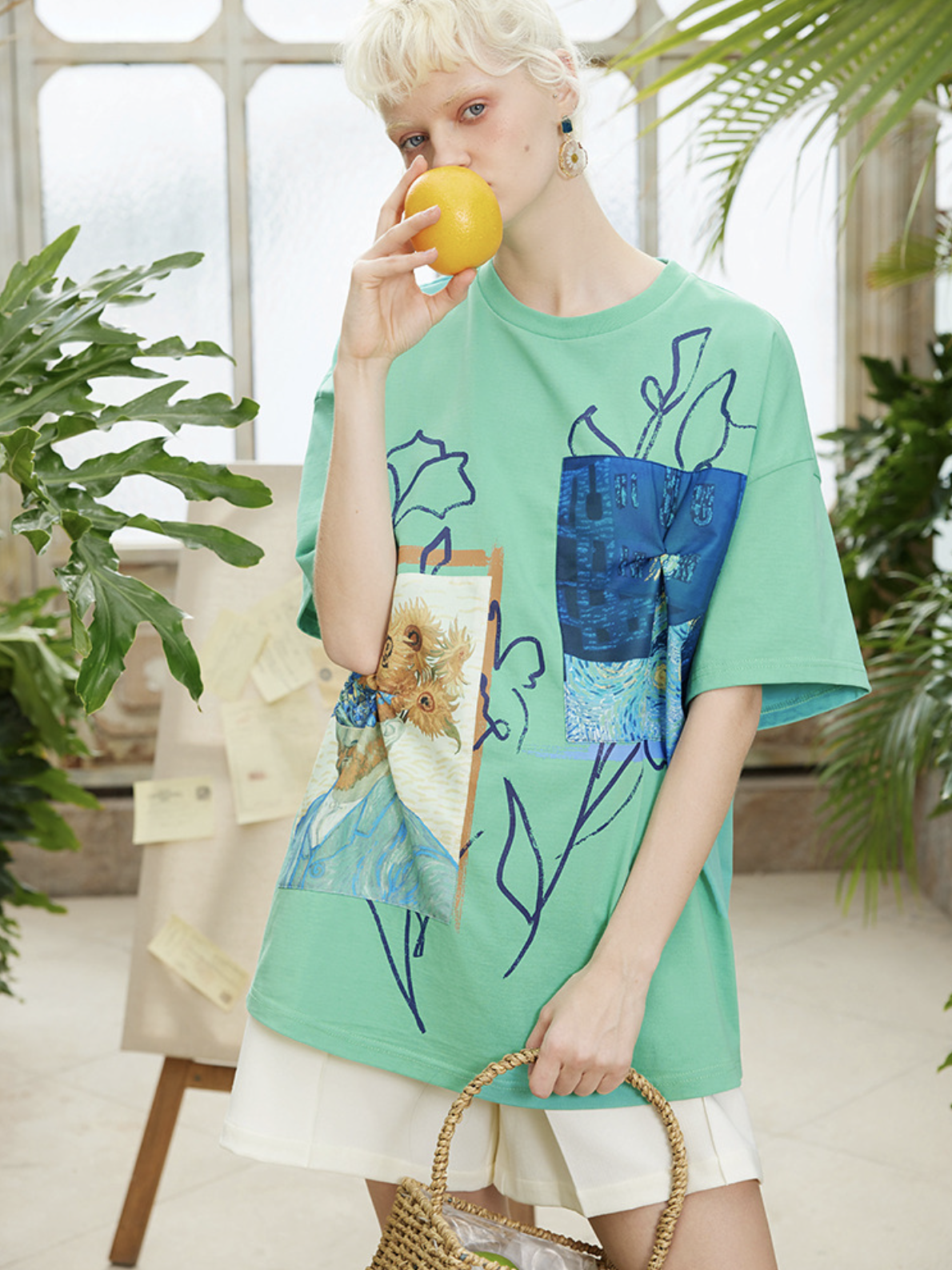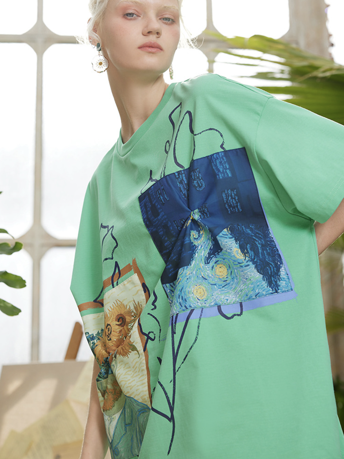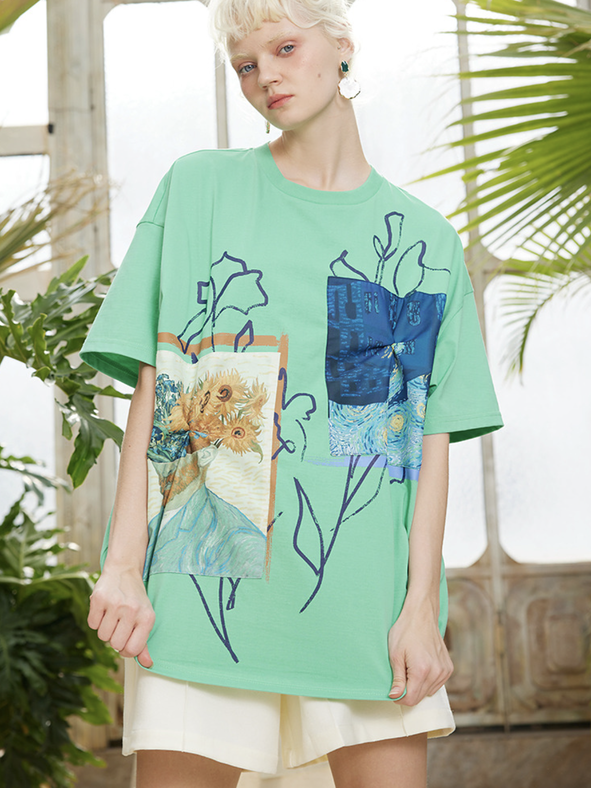 A T-shirt featuring Van Gogh's "Sunflowers in a Vase" and "Iris".