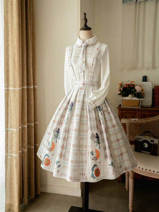 Persimmon cat and flower plaid strap skirt, vest and pleated blouse (beige)