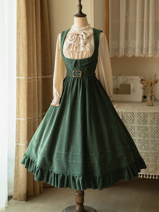 Dark green lady jumper skirt and high neck ribbon blouse