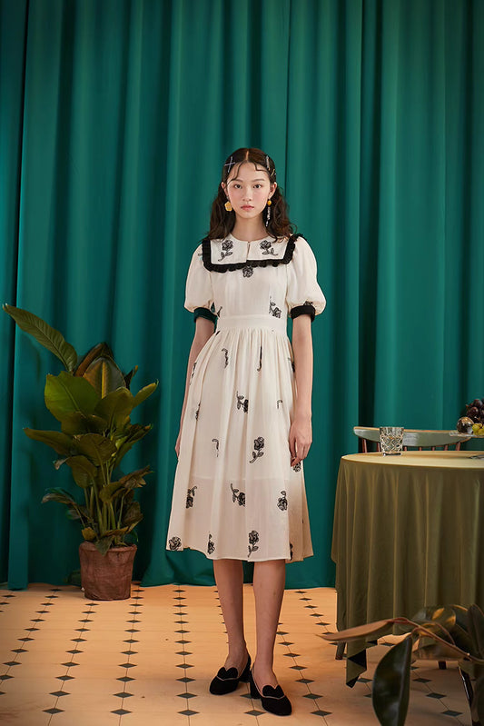 High Waist Lace Collar Cotton Rose Dress