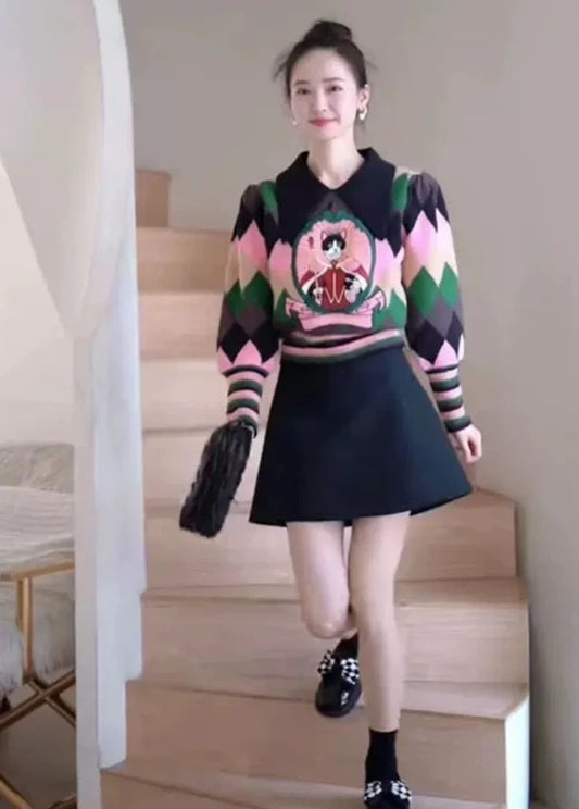 puff sleeves white cat jacquard short knitted tops