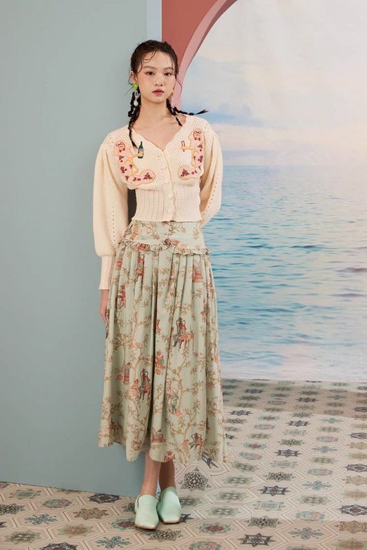 retro French waist hand-painted owl pleated skirt