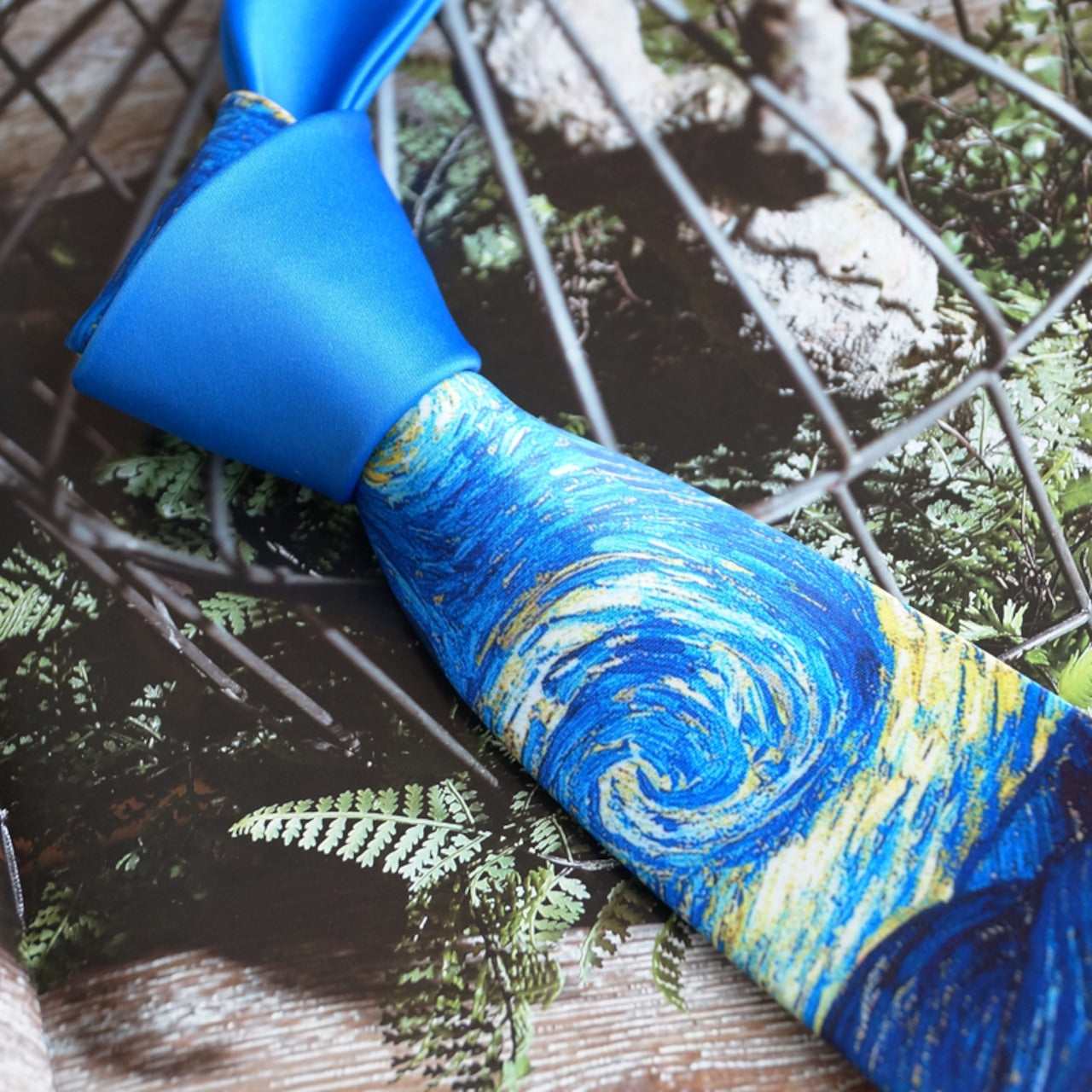 It depicts the stars shining in the night sky and the ultramarine swirling landscape.