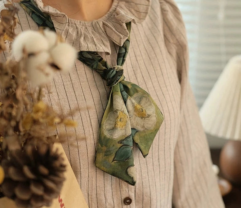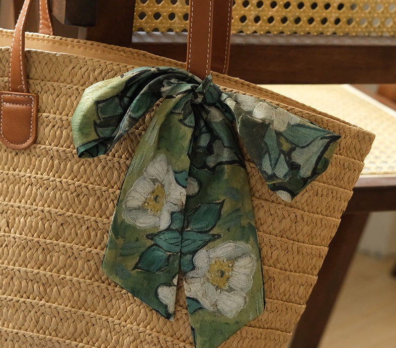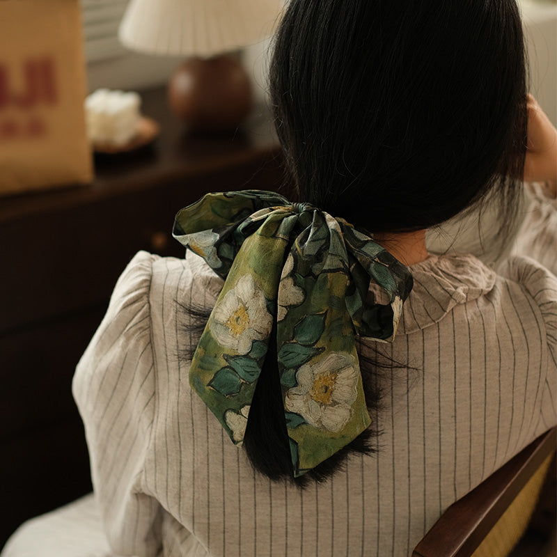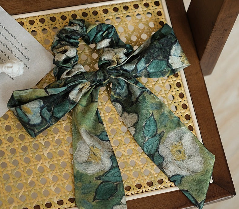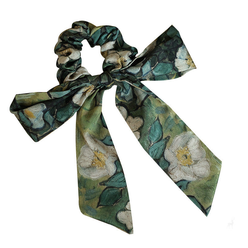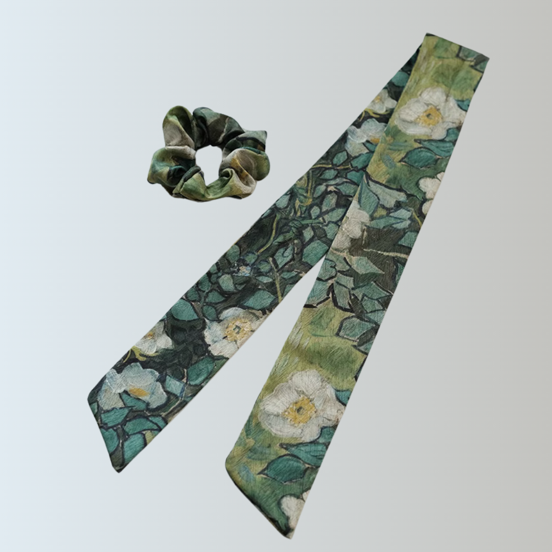 A scrunchie and ribbon set featuring Van Gogh's "Wild Roses".
