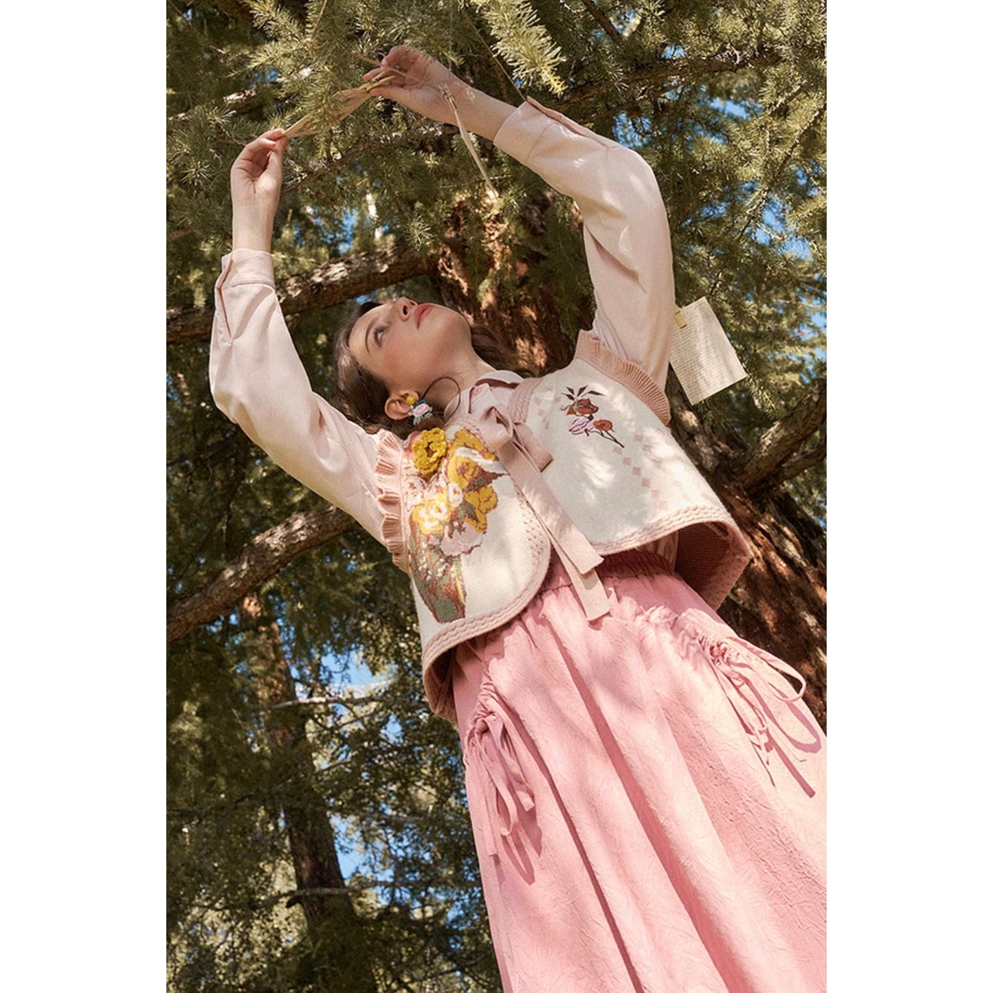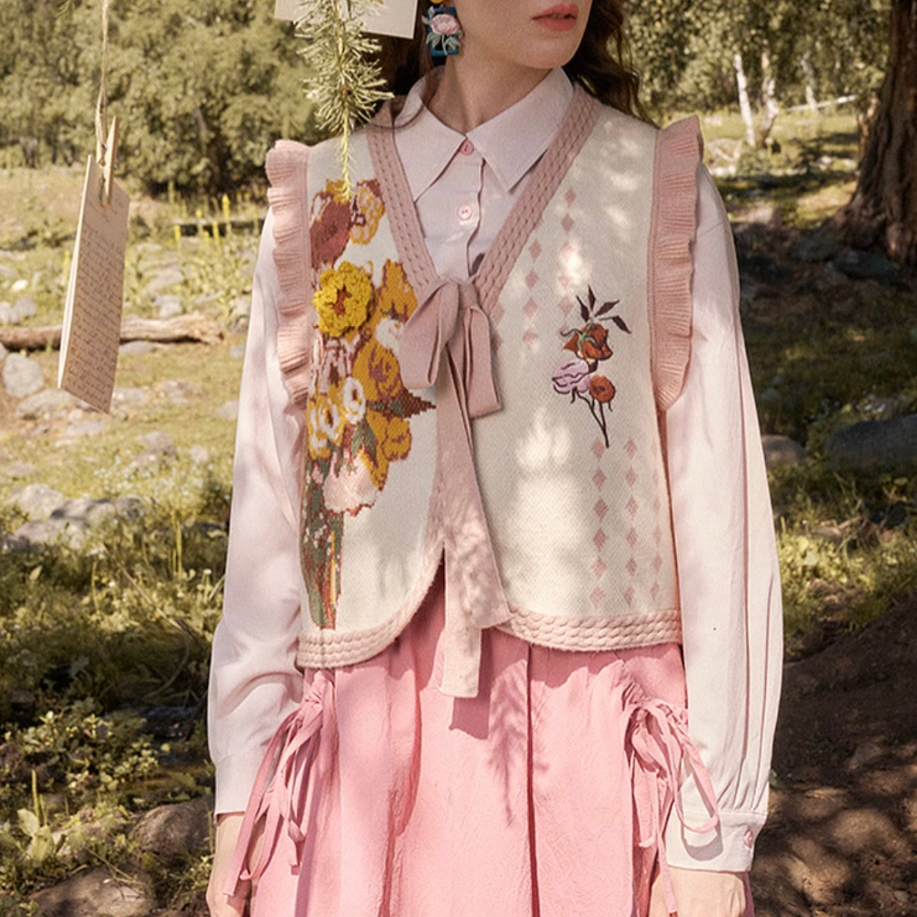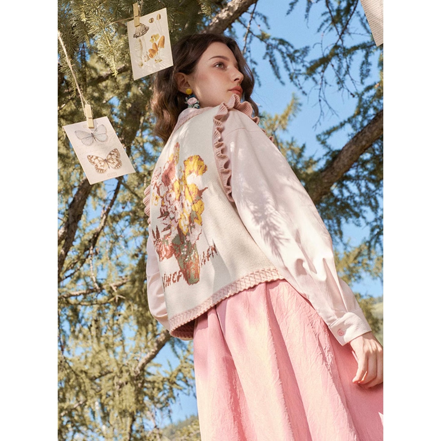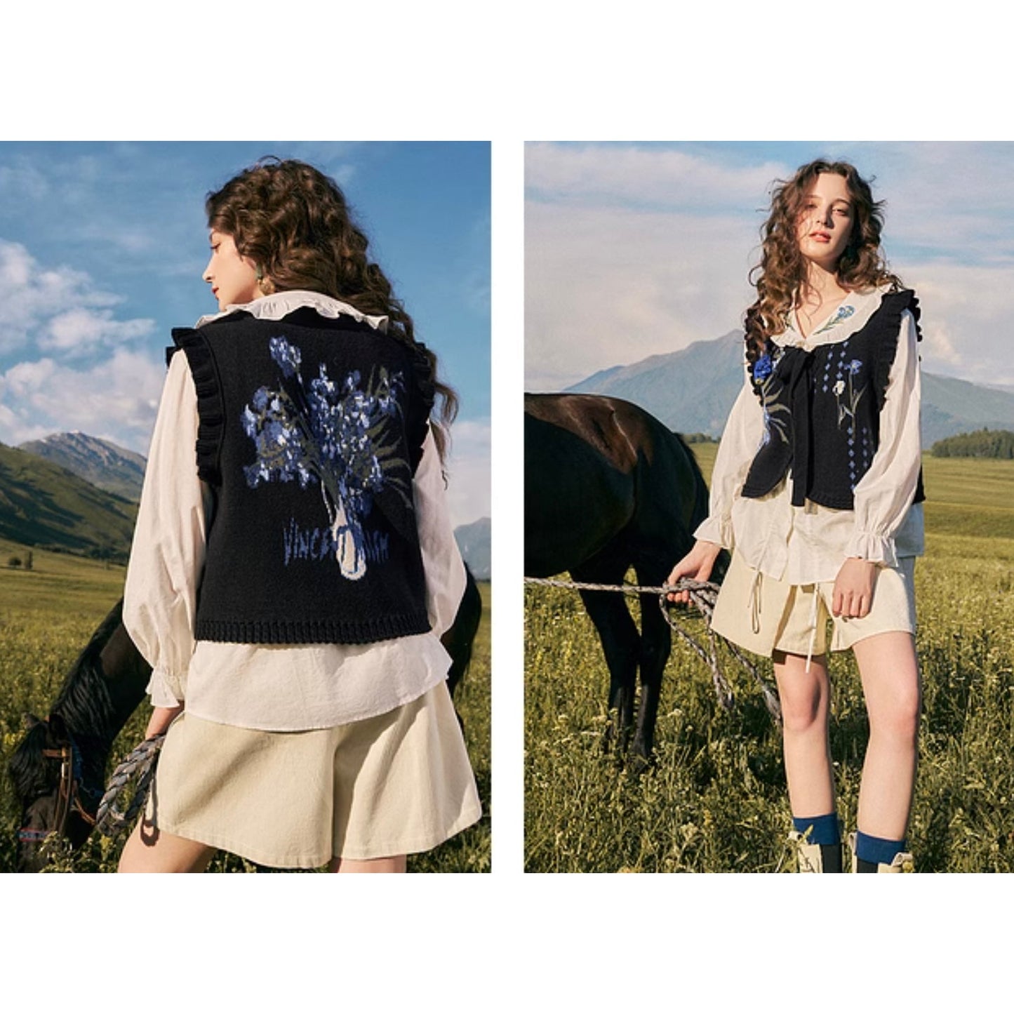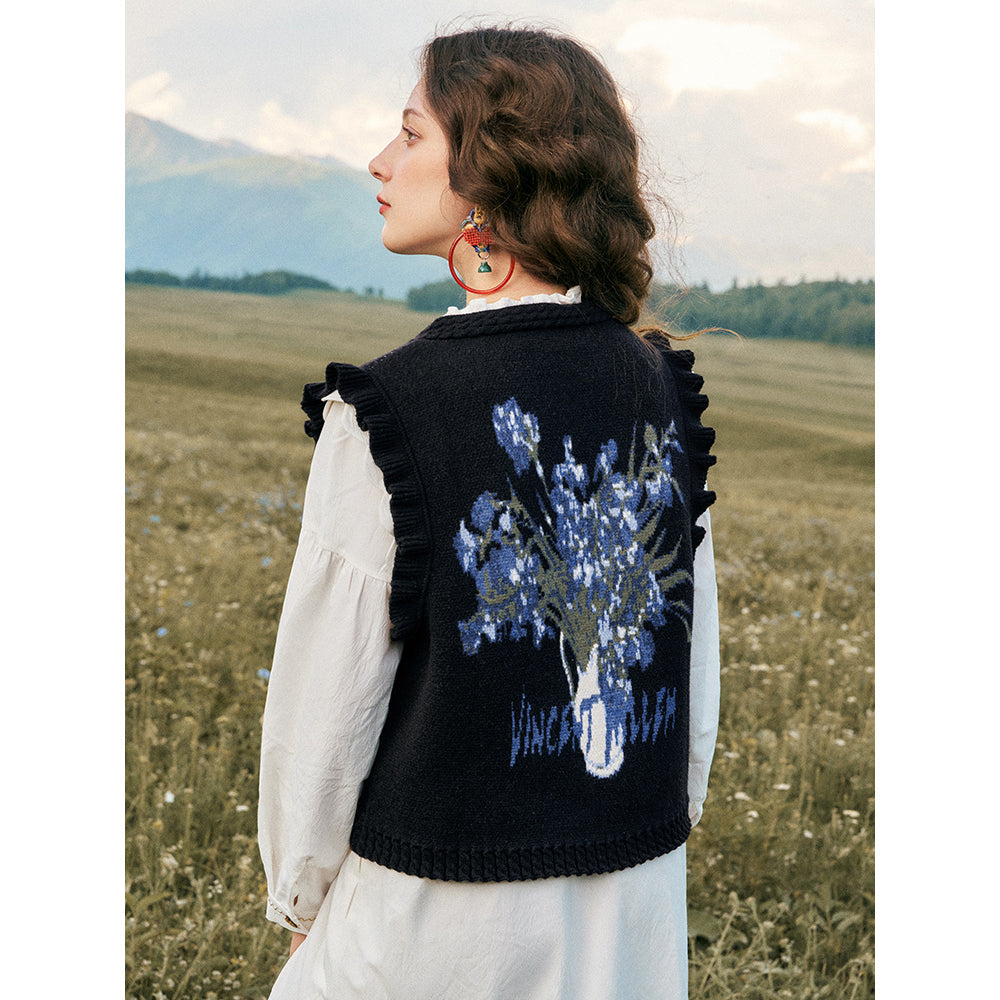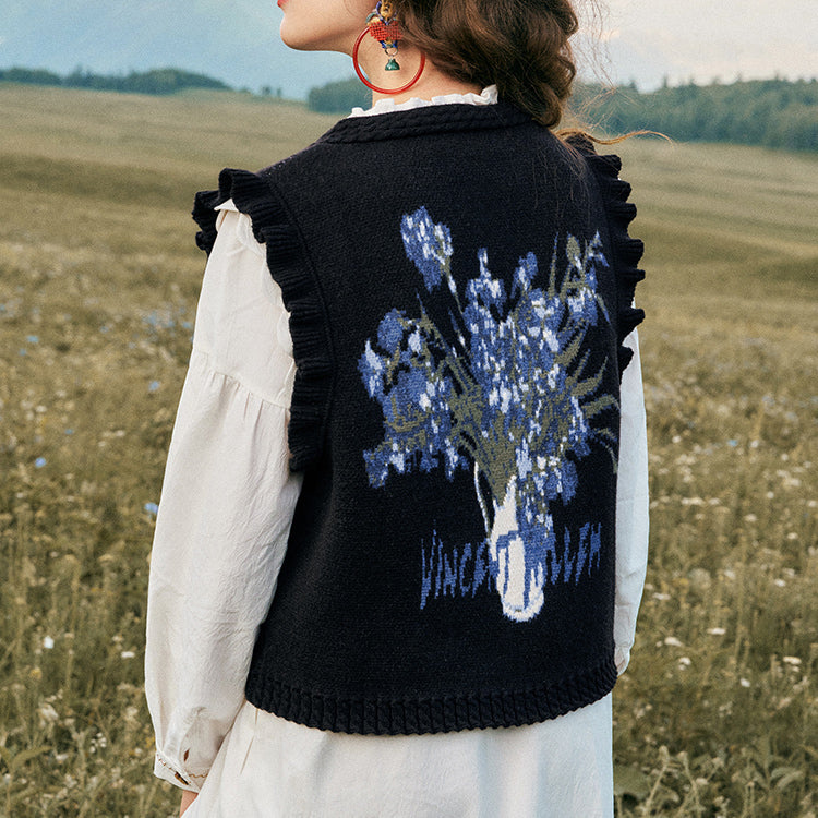 A knitted vest paying homage to Van Gogh's paintings "Vase with Irises" and "Japanese Vase with Roses and Anemones."