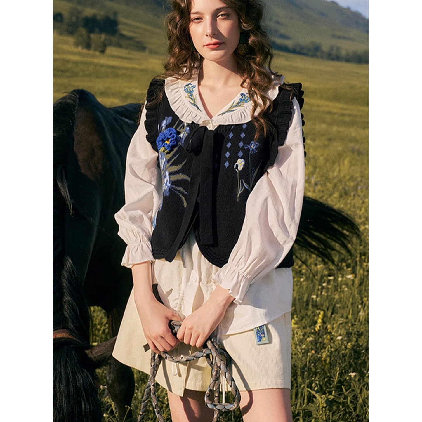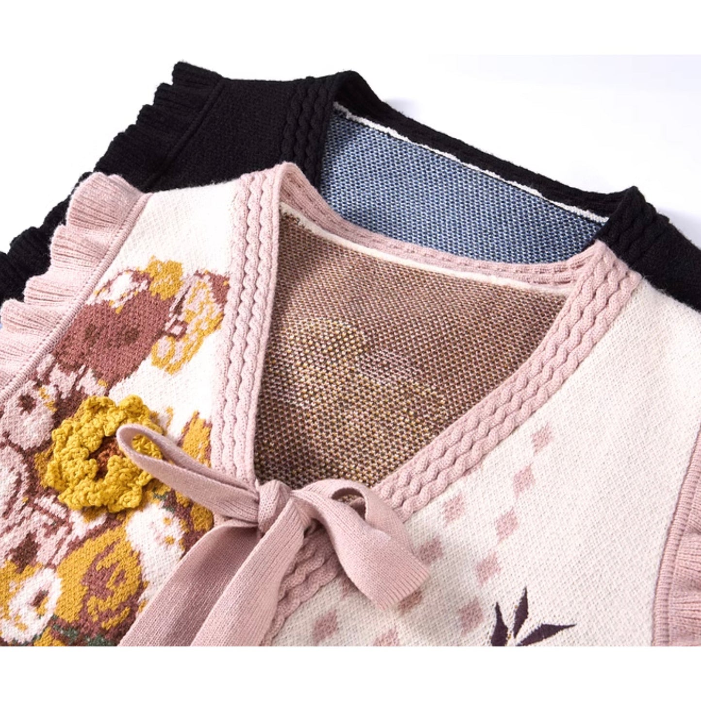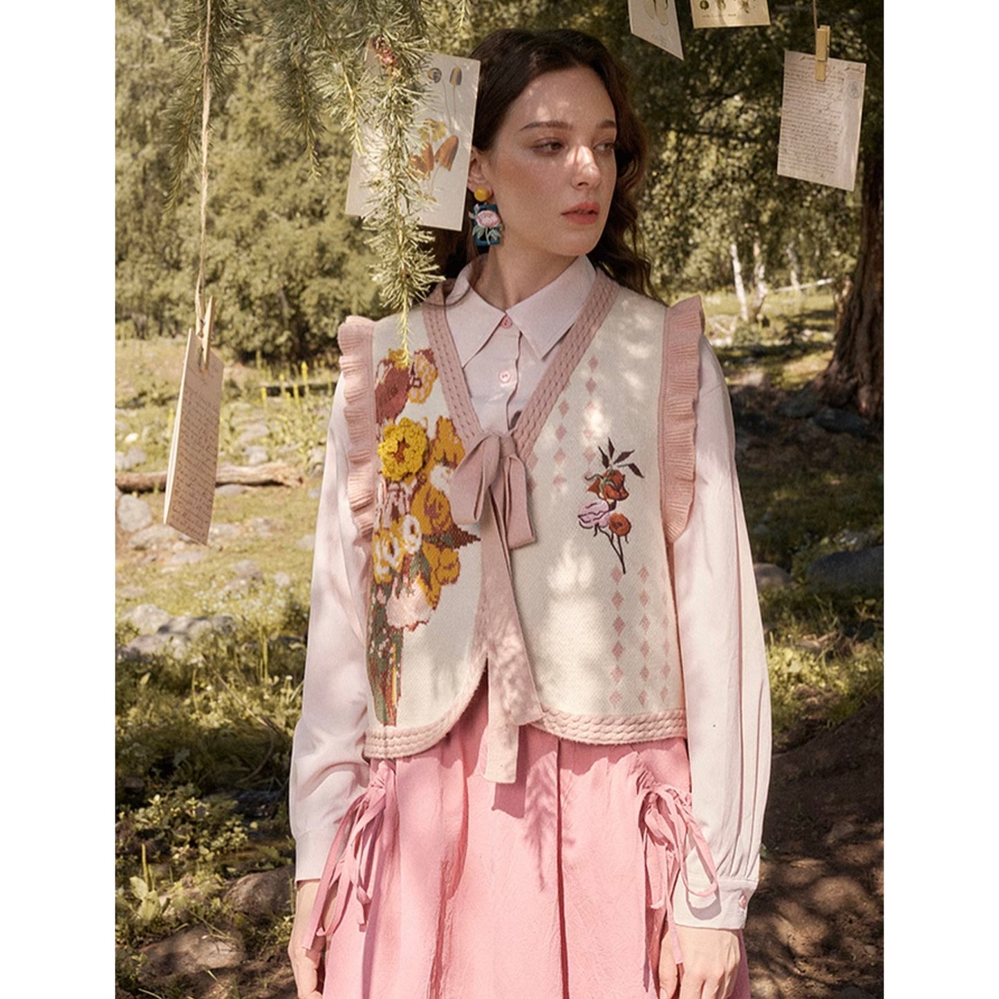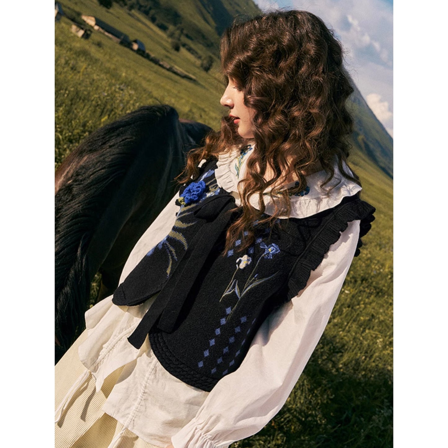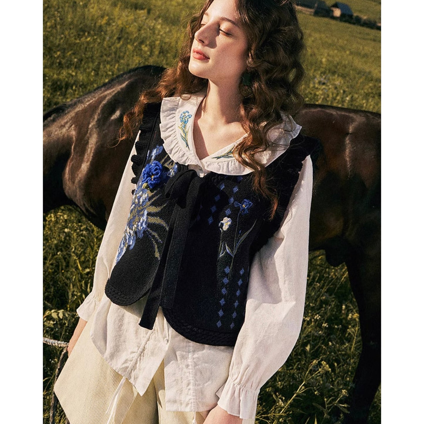 A knitted vest paying homage to Van Gogh's paintings "Vase with Irises" and "Japanese Vase with Roses and Anemones."