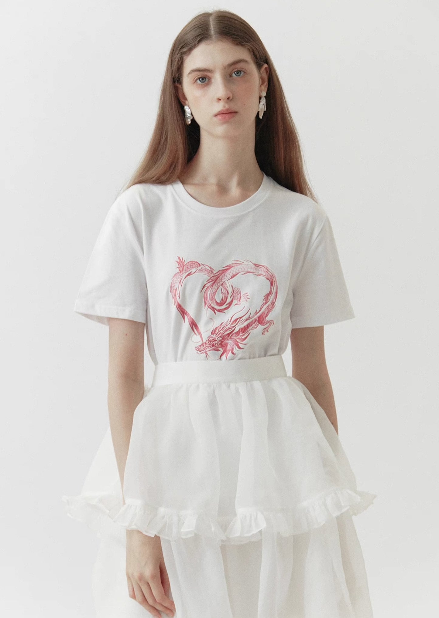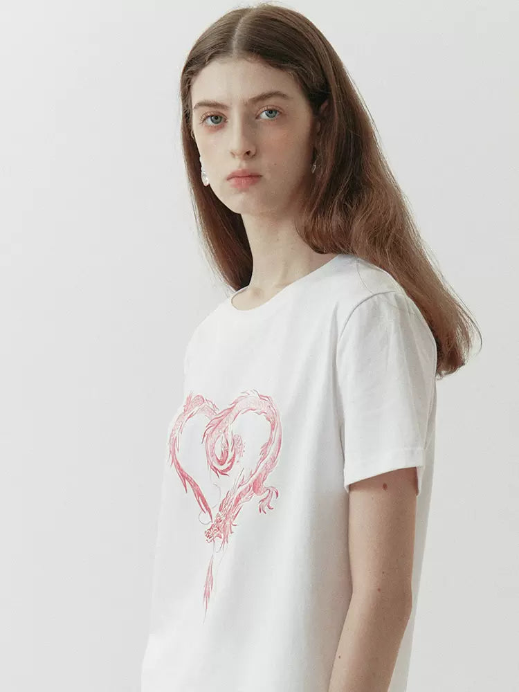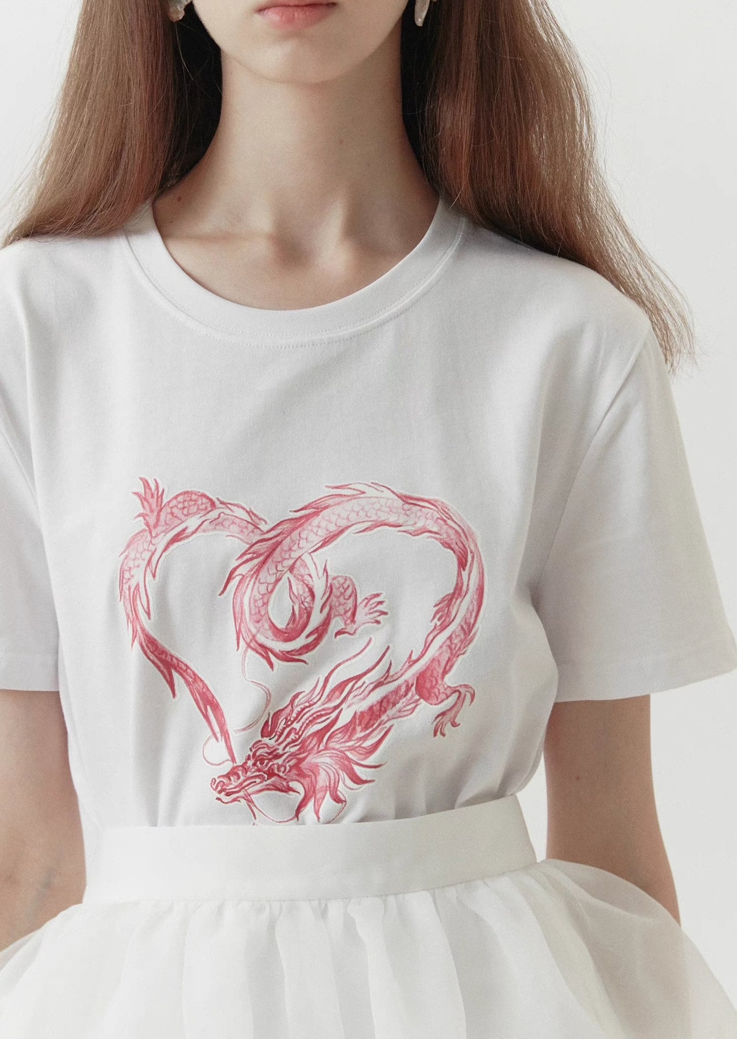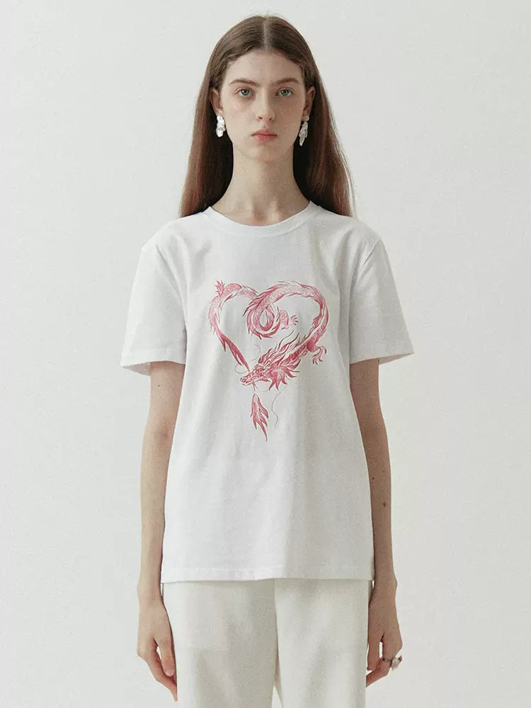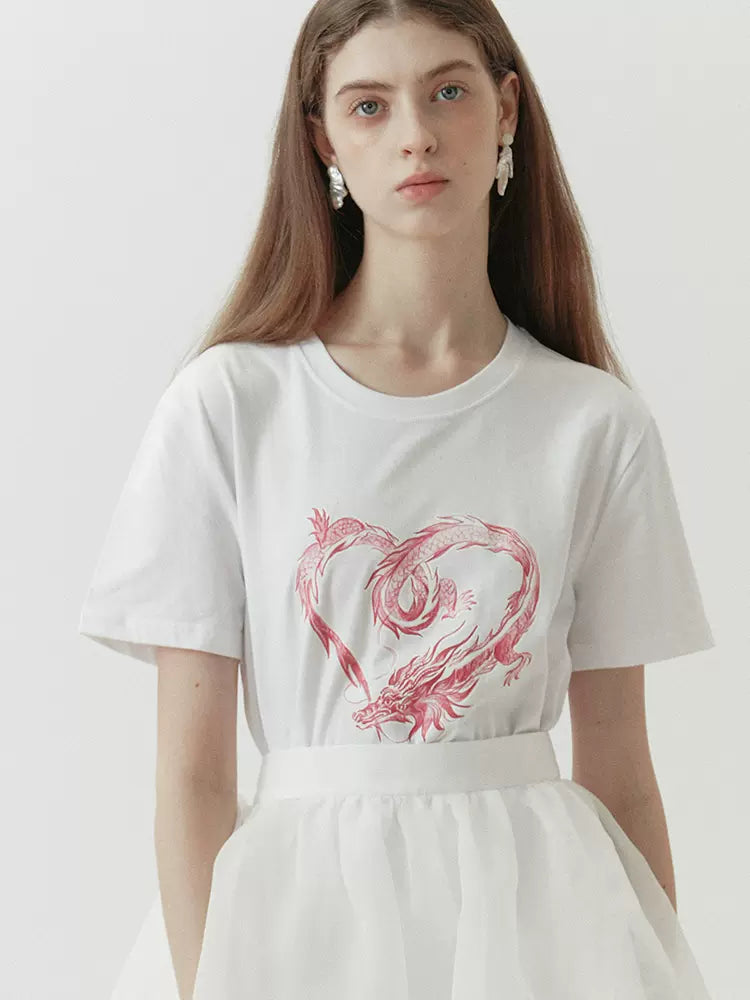 dragon sticker white round neck short-sleeved T-shirt