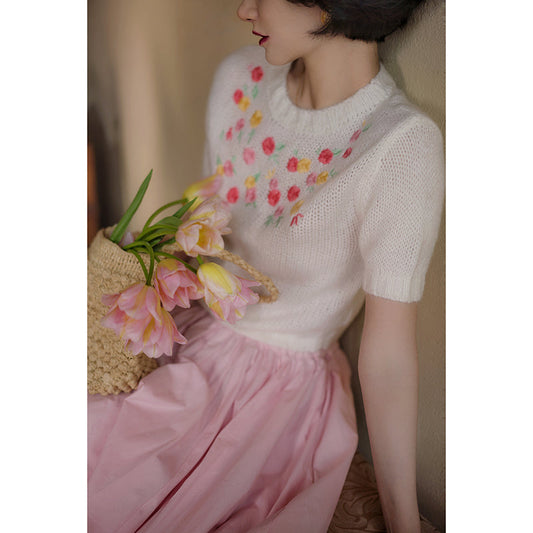 Bird-and-flower painting blouse of a small bird perched on a tree branch