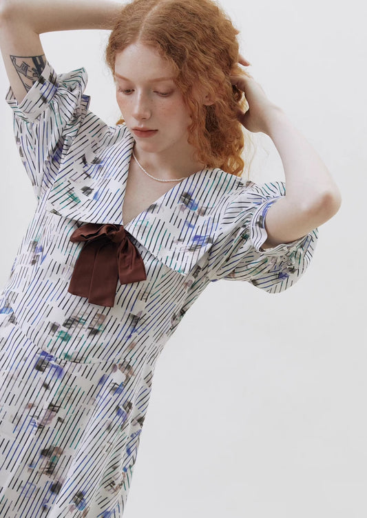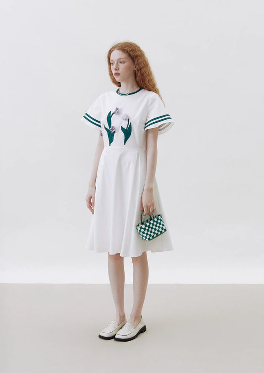 oblique placket panda embroidered stand collar small white dress