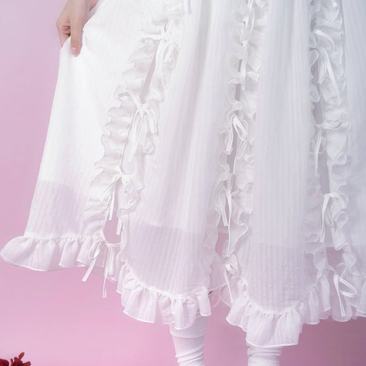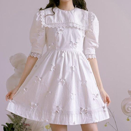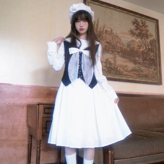 Sailor Neck Bow Pleated Long Sleeve Lace Dress