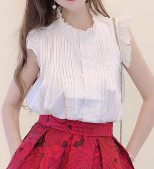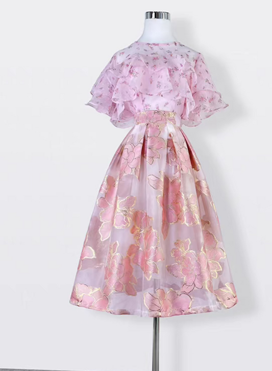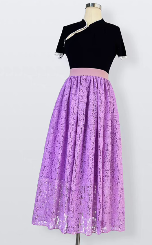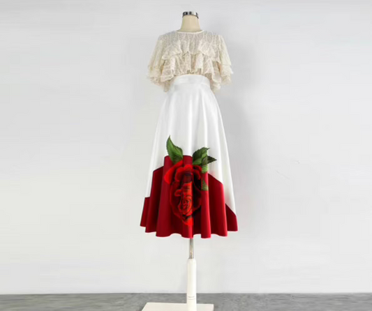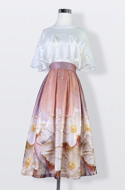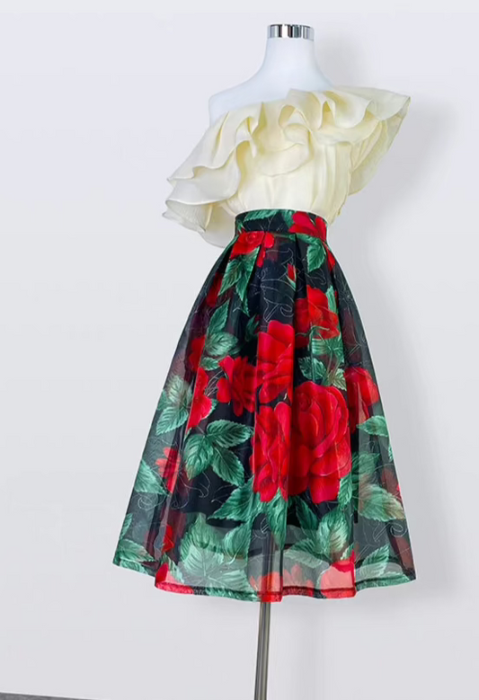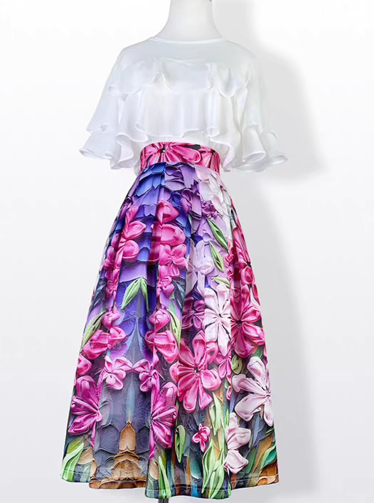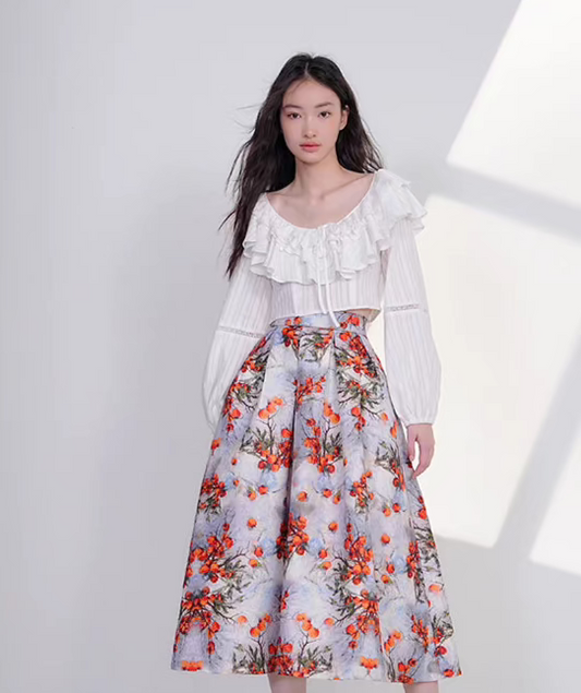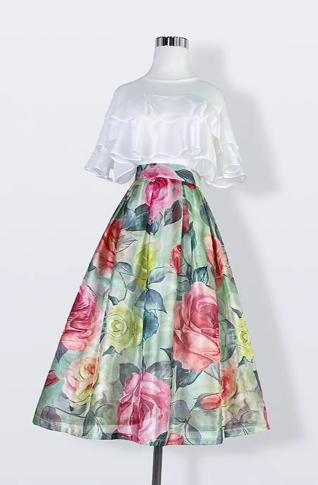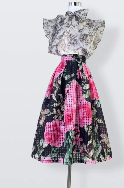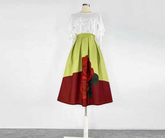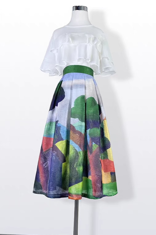 high-end elegant color-blocked printed high-waisted skirt