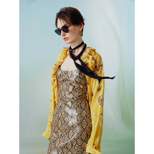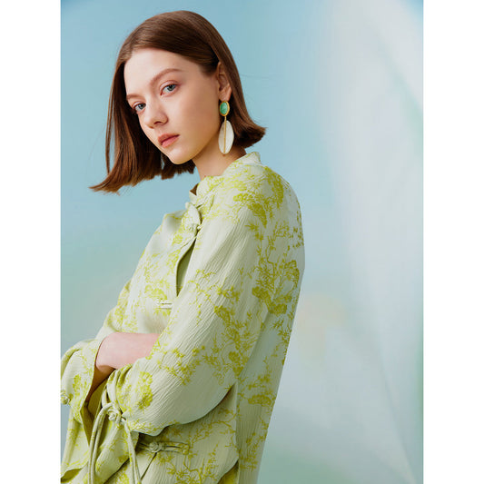 Yellow-green plant pattern cheongsam blouse and long skirt