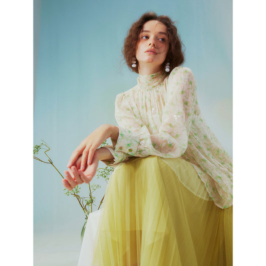 Swan embroidery and floral chiffon blouse