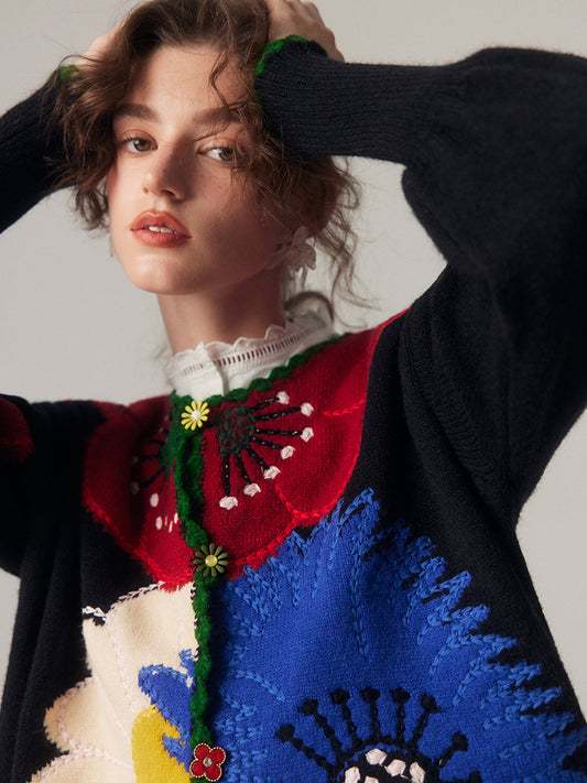 Vivid large flower retro embroidery knit cardigan