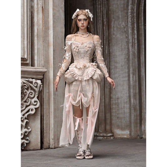 Pure white lady gothic ribbon blouse & ruffled skirt