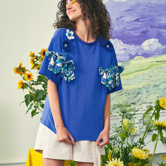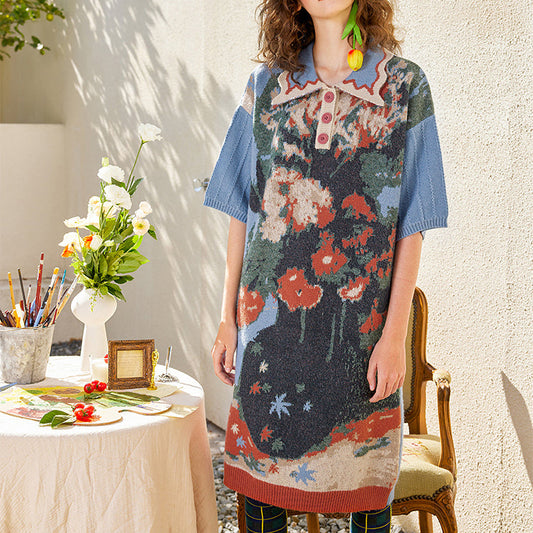 花瓶の向日葵と花瓶のヤグルマギクとケシのニットポロワンピース