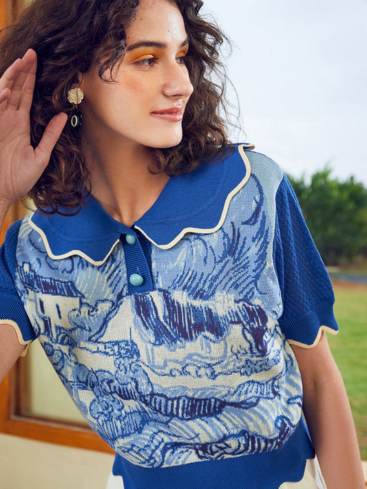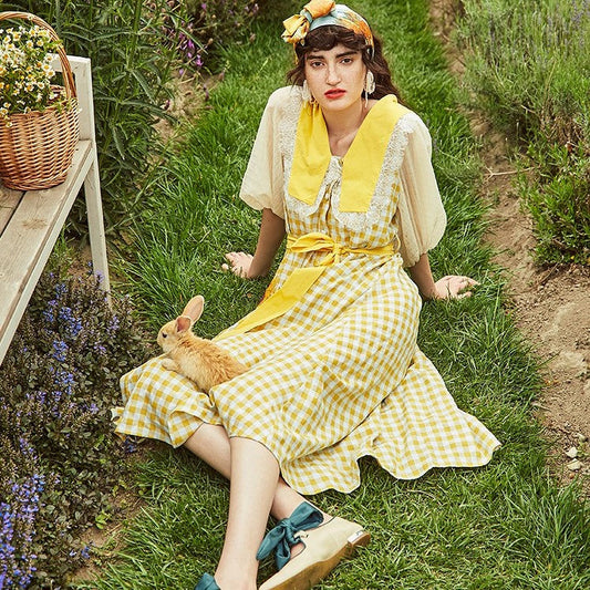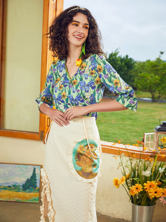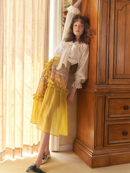 家々のある風景と刈り入れをする人のいる麦畑のフリルスカート