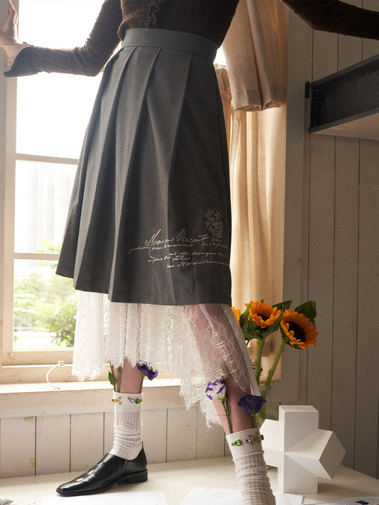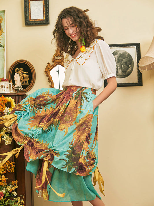 花瓶の向日葵と花瓶のヤグルマギクとケシのリボンプリーツスカート