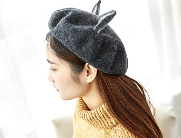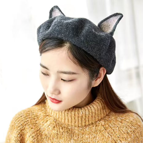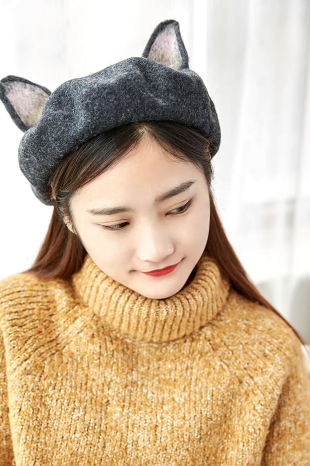 Wool Felt Dark Linen Gray Cat Ears Beret