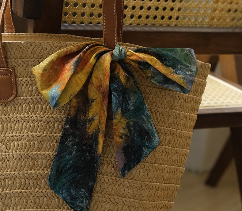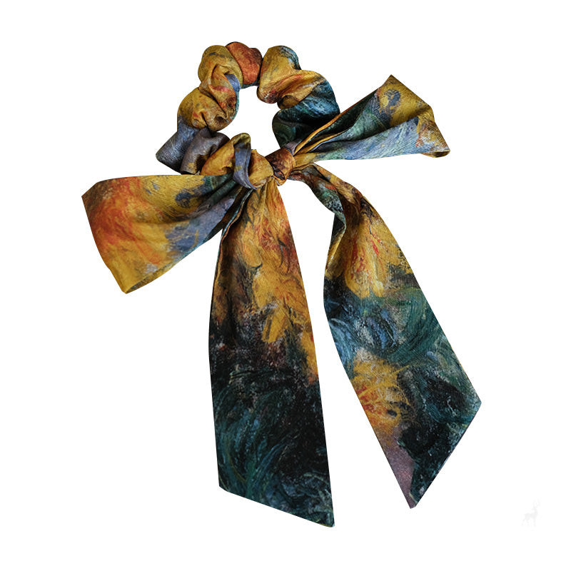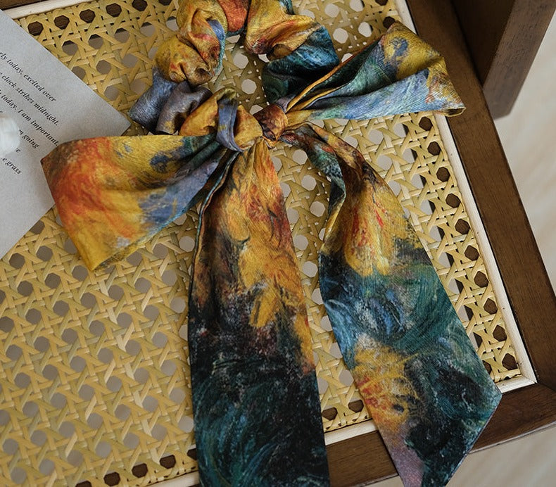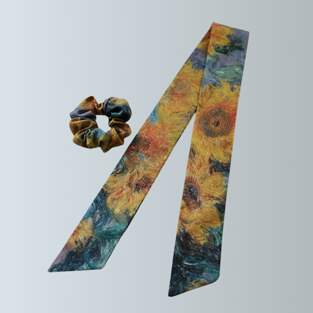 クロード・モネ の『ひまわり』が描かれたシュシュとリボンのセット。