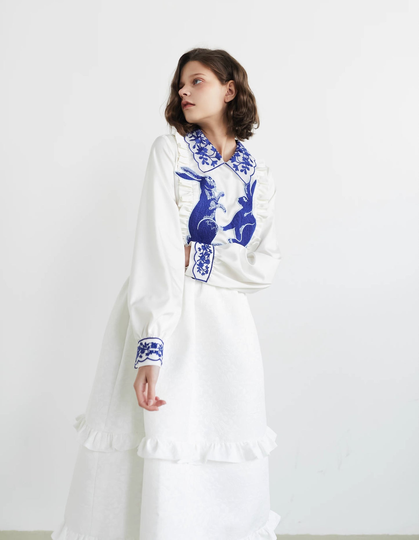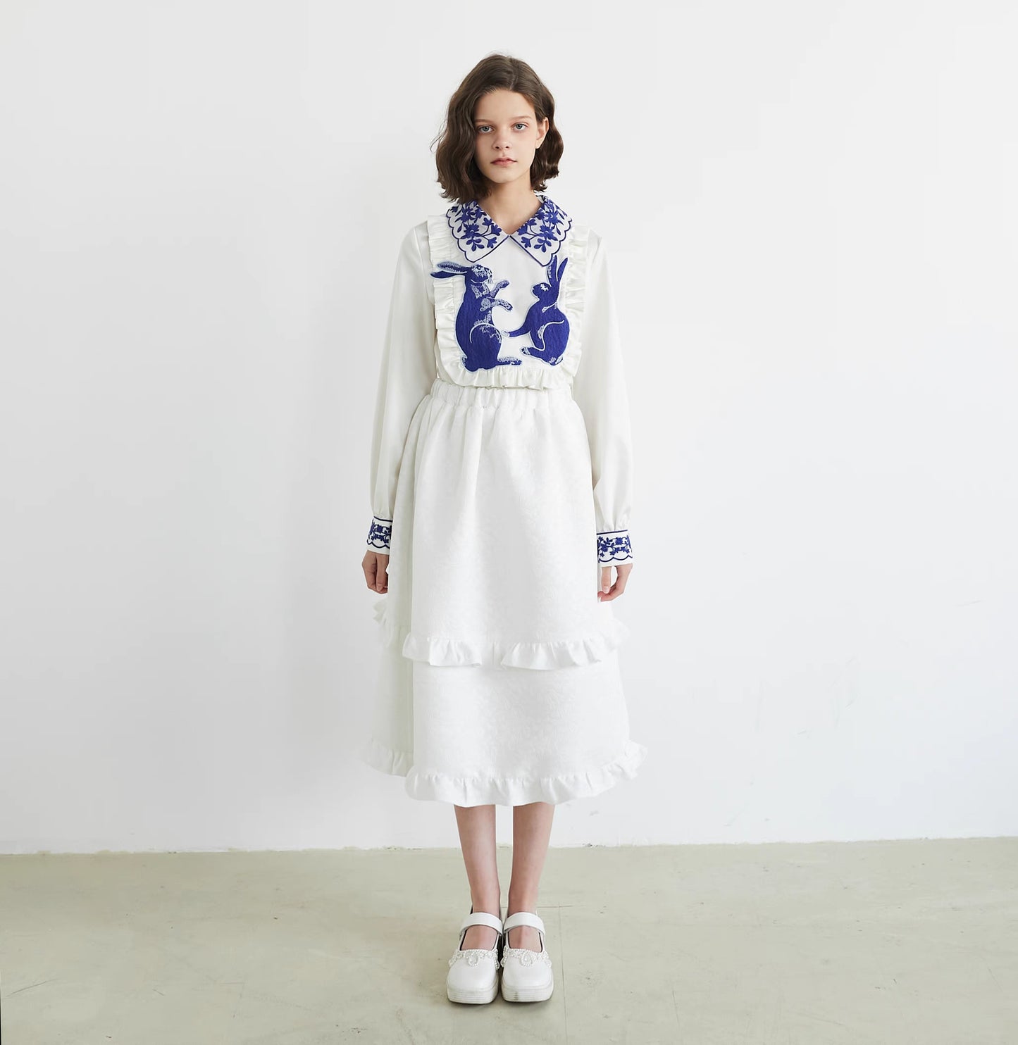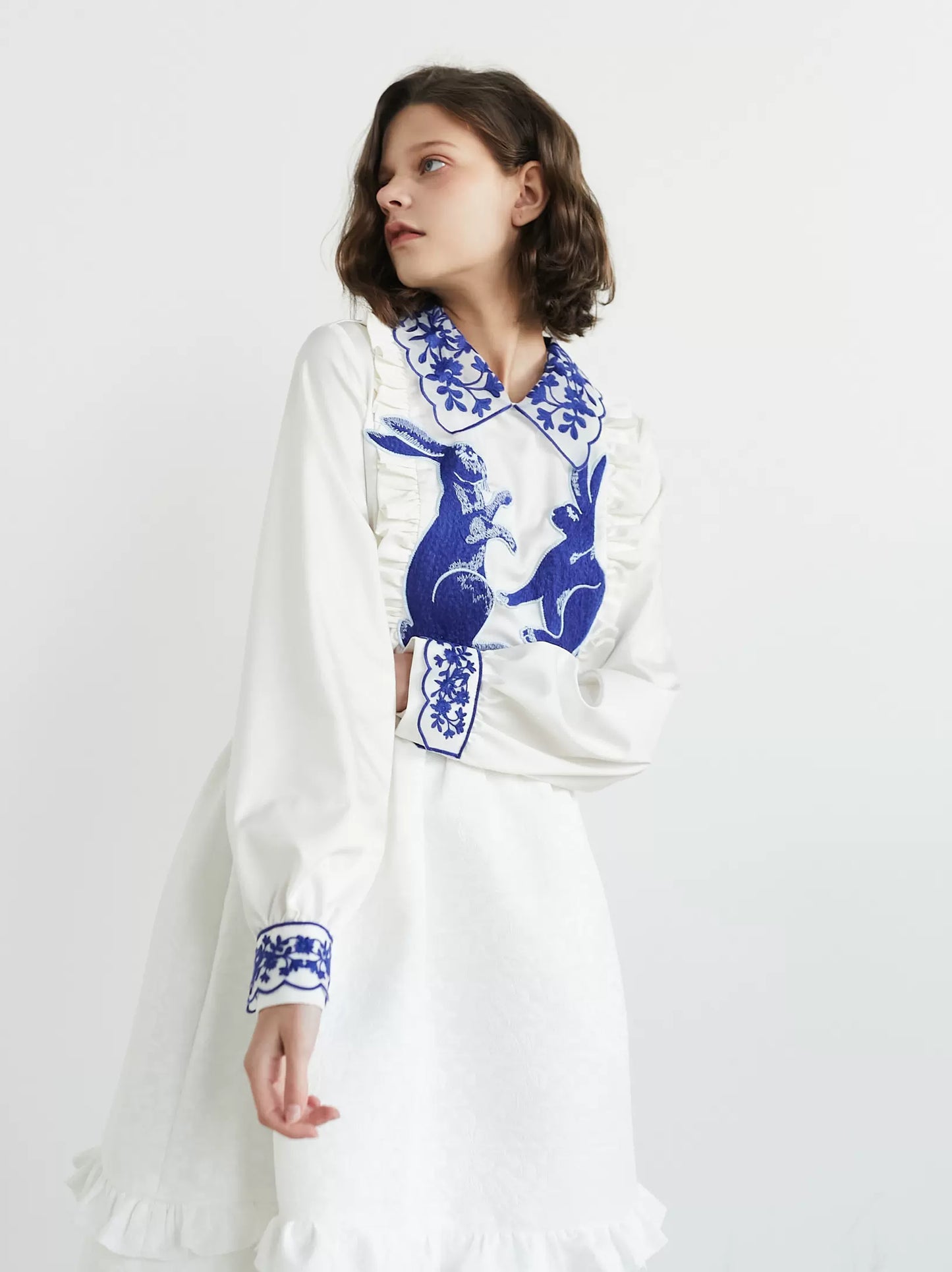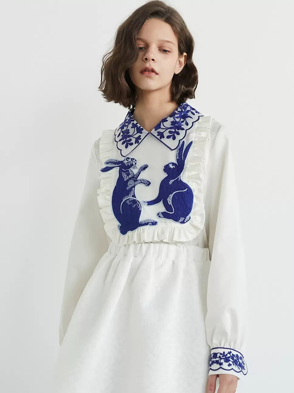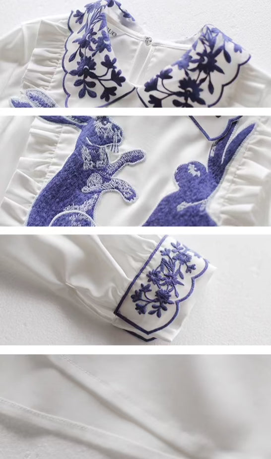 blue and white rabbit shirt embroidered lapel fungus top