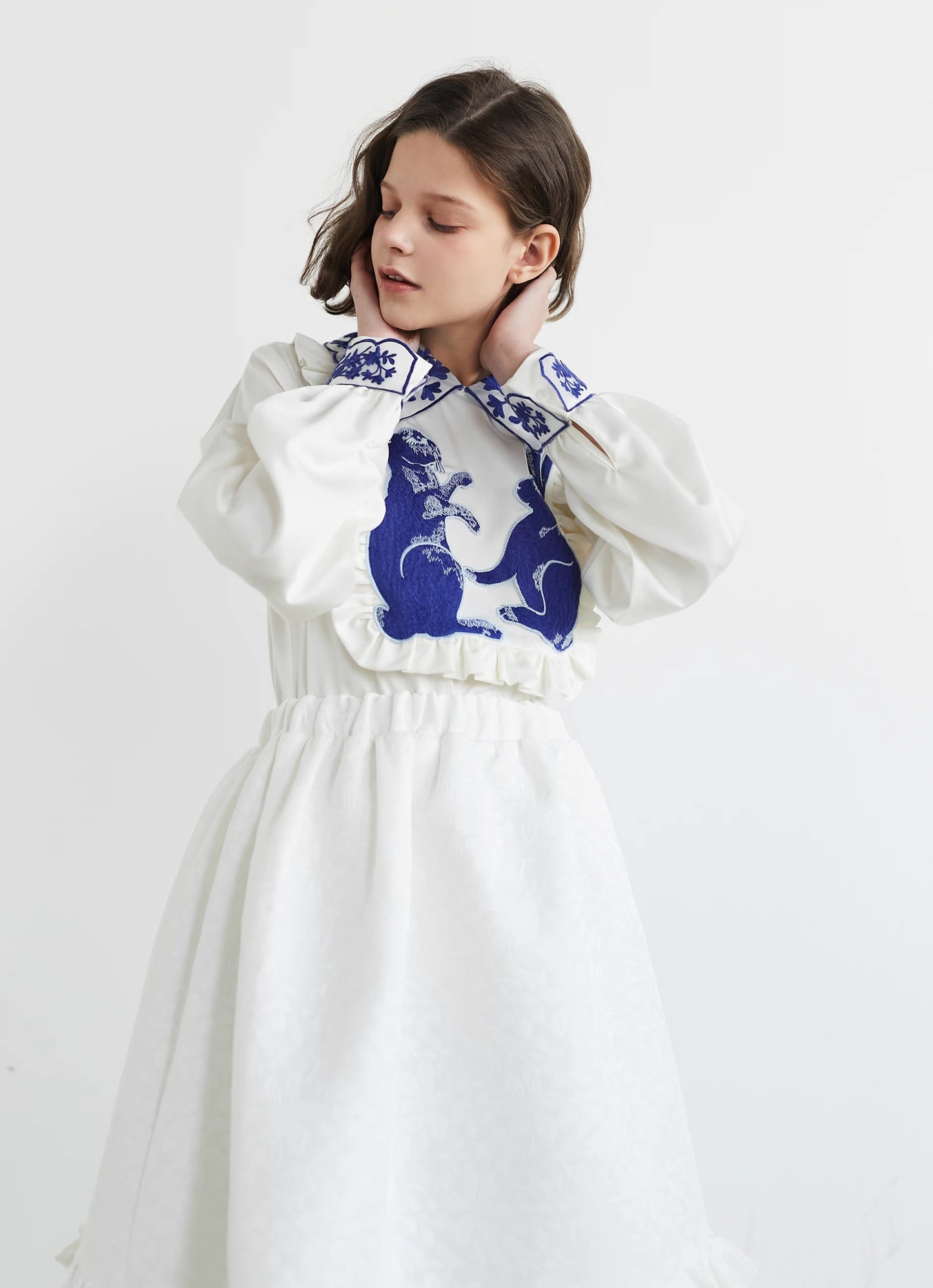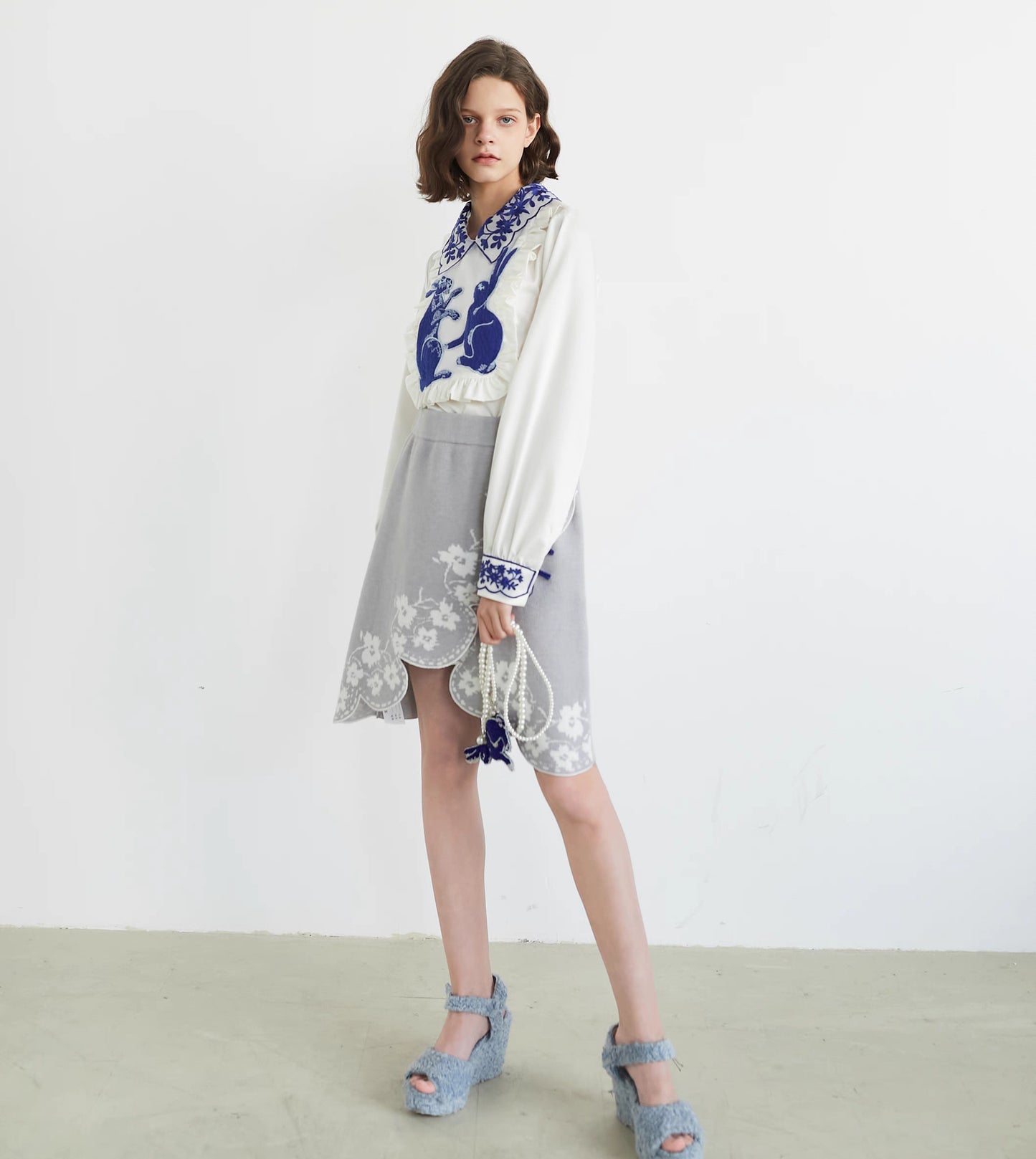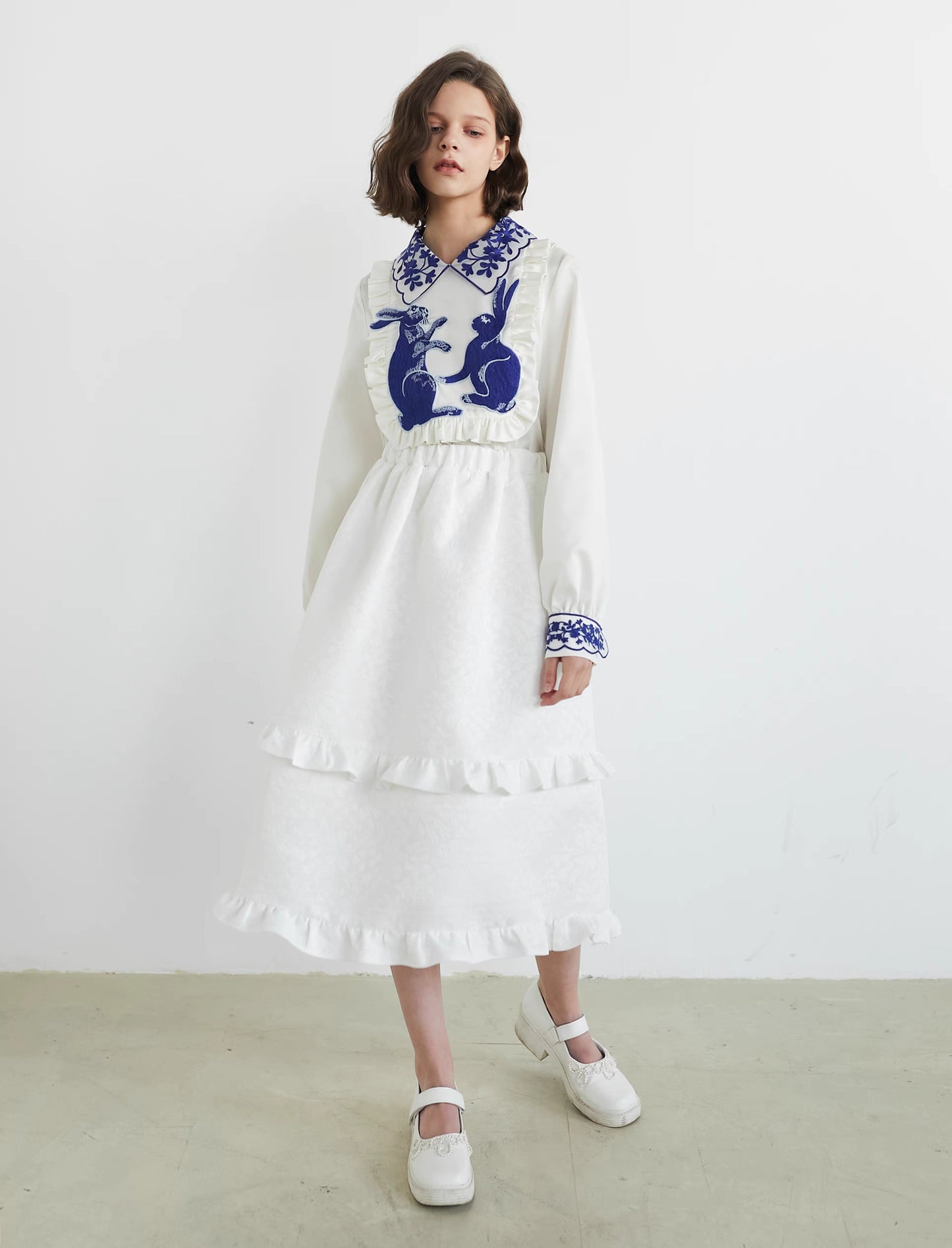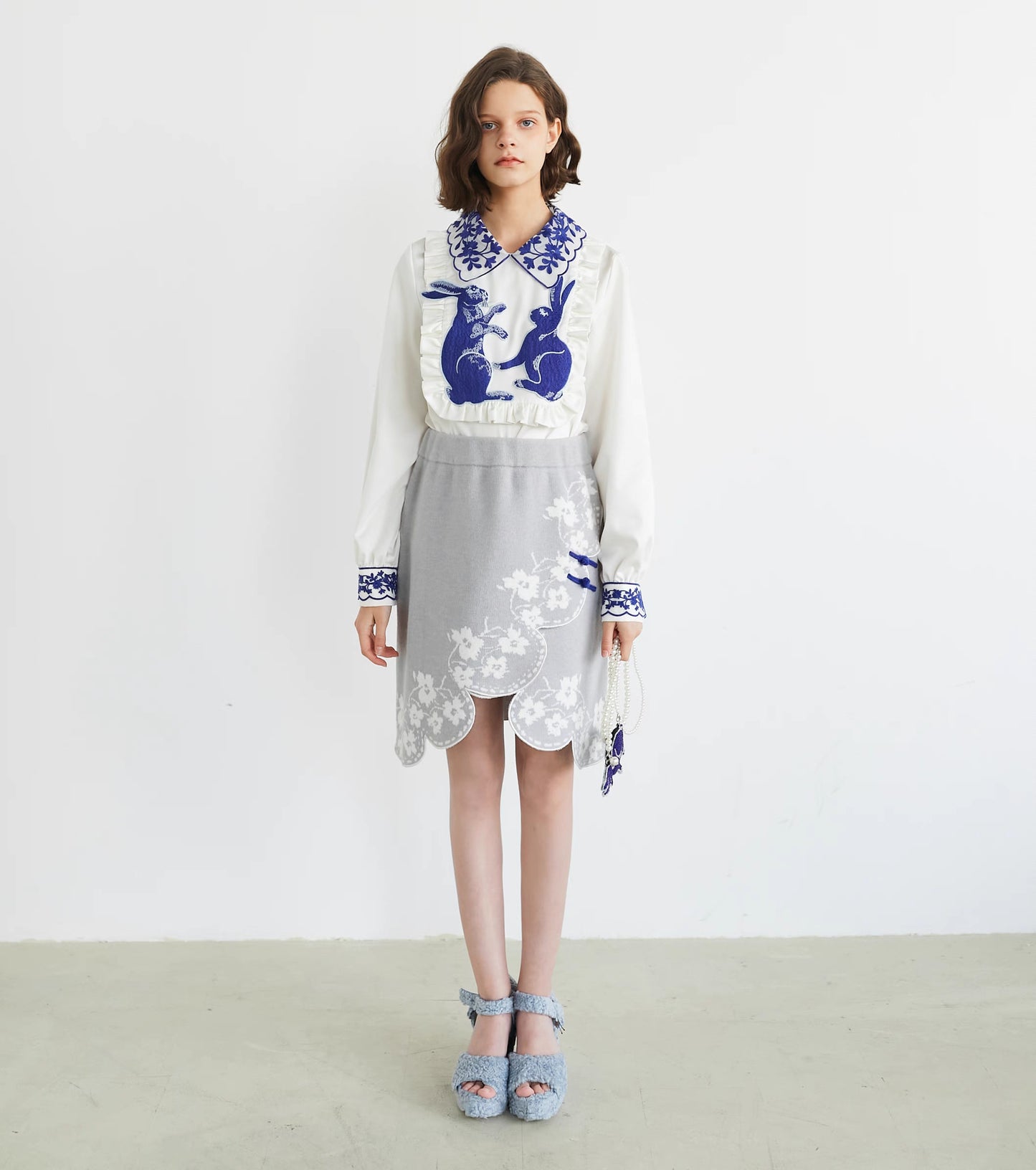 blue and white rabbit shirt embroidered lapel fungus top