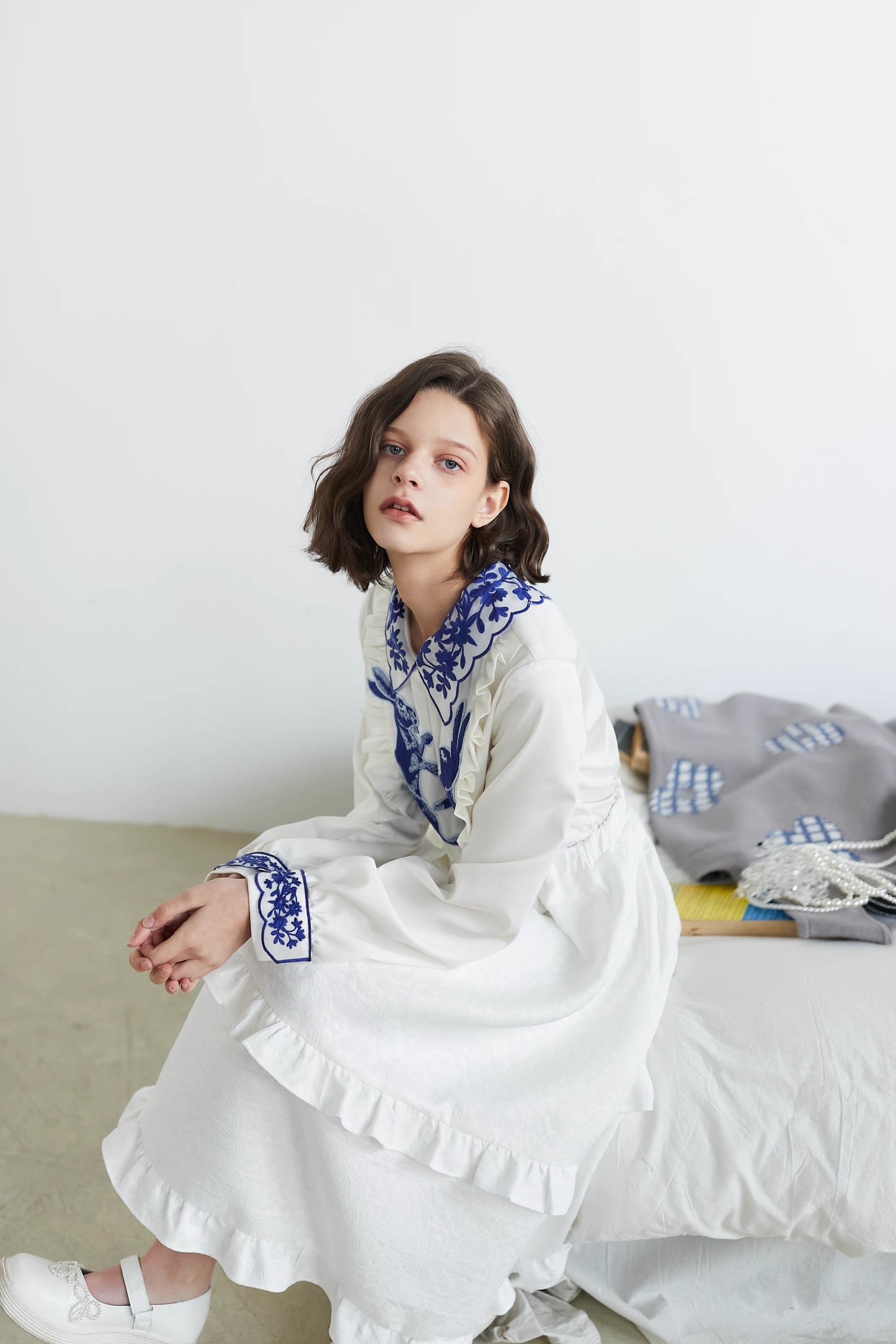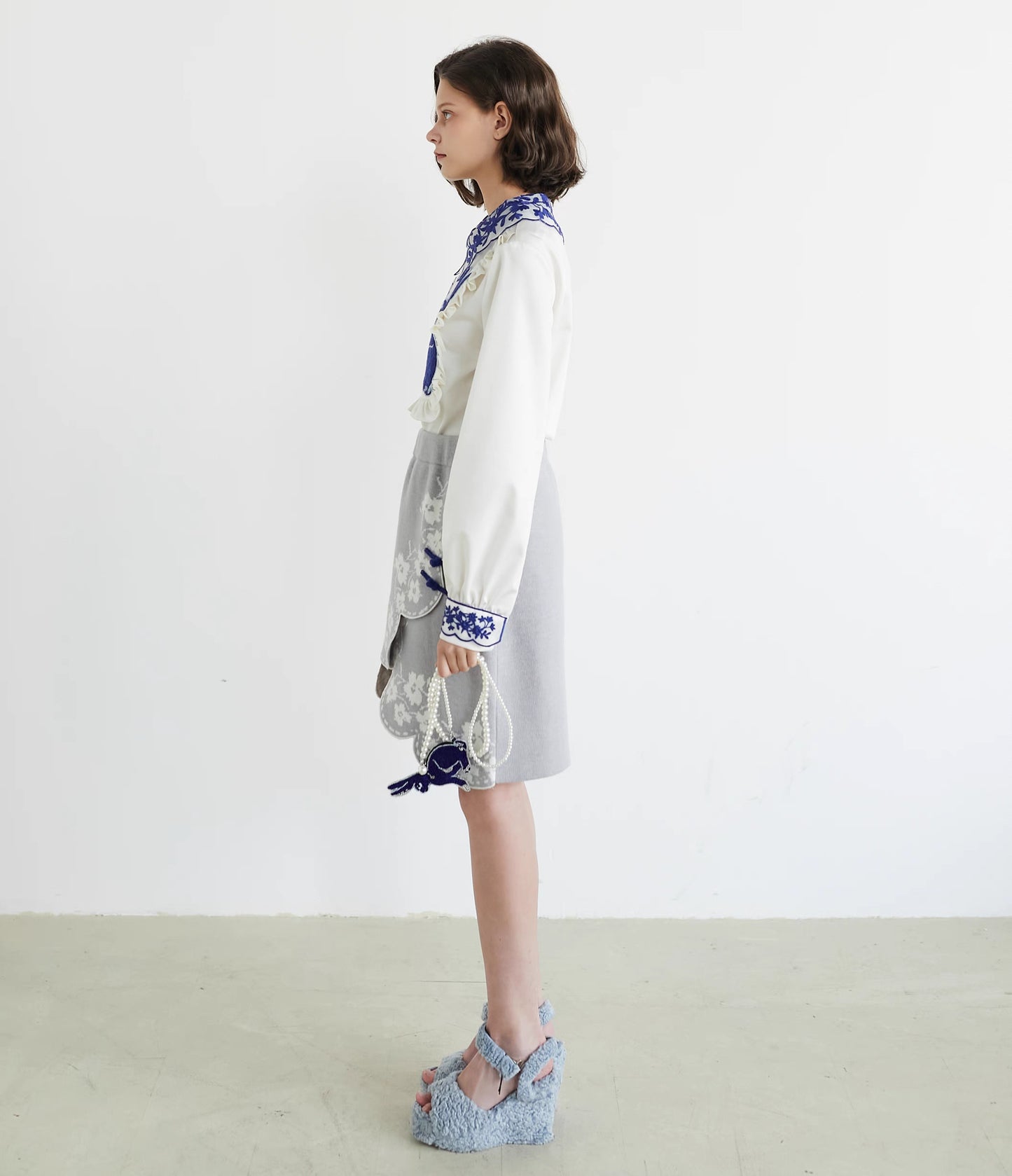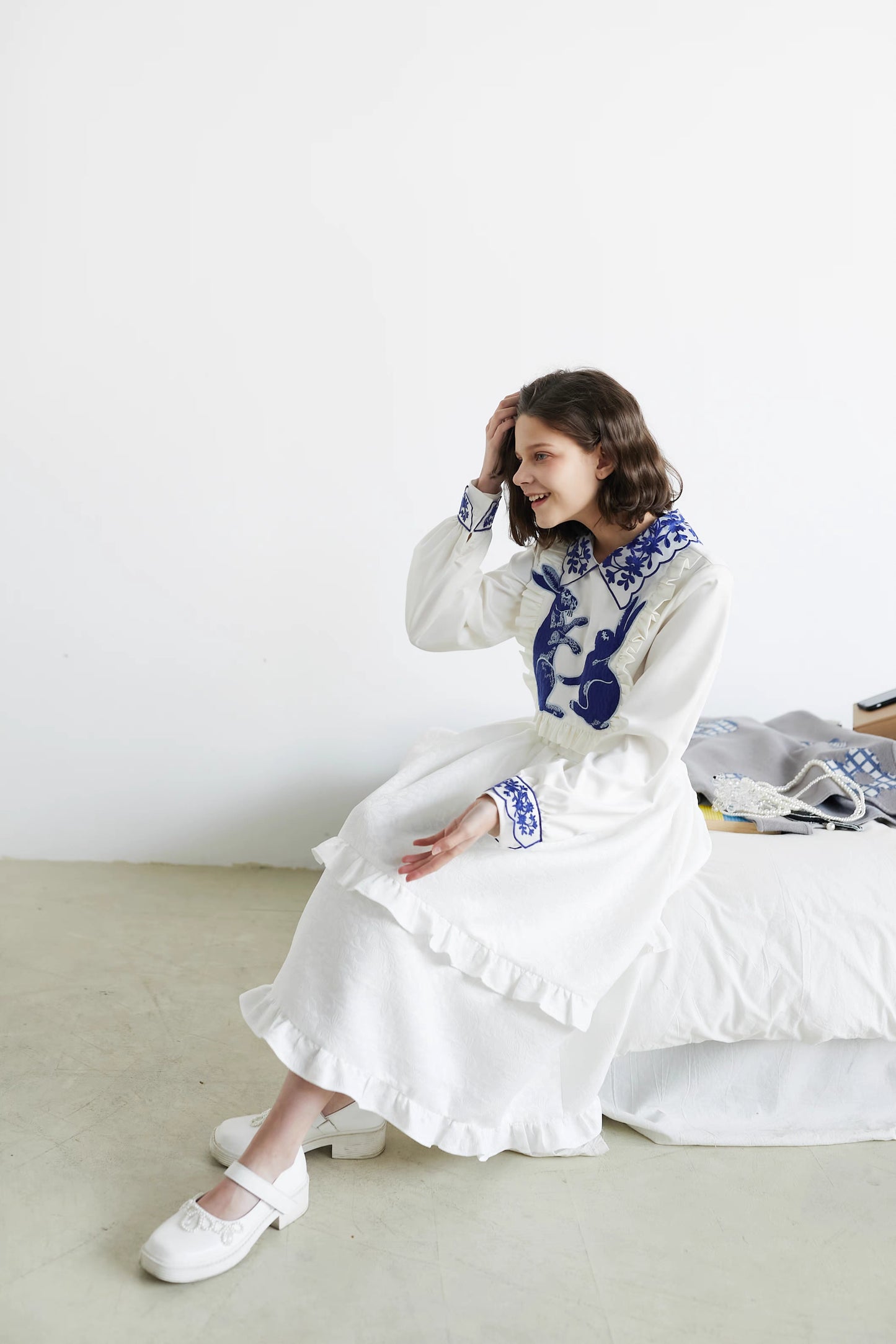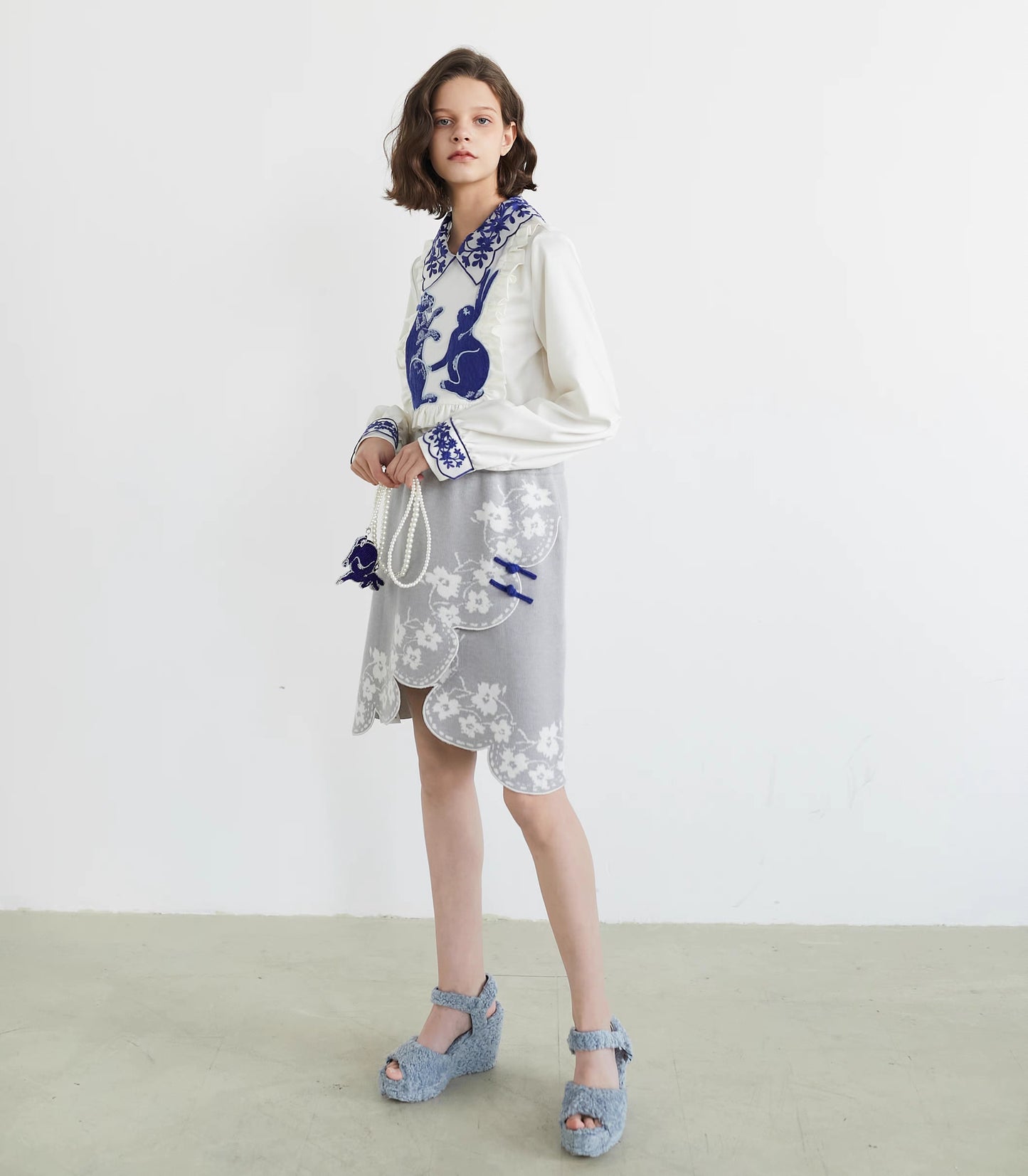 blue and white rabbit shirt embroidered lapel fungus top