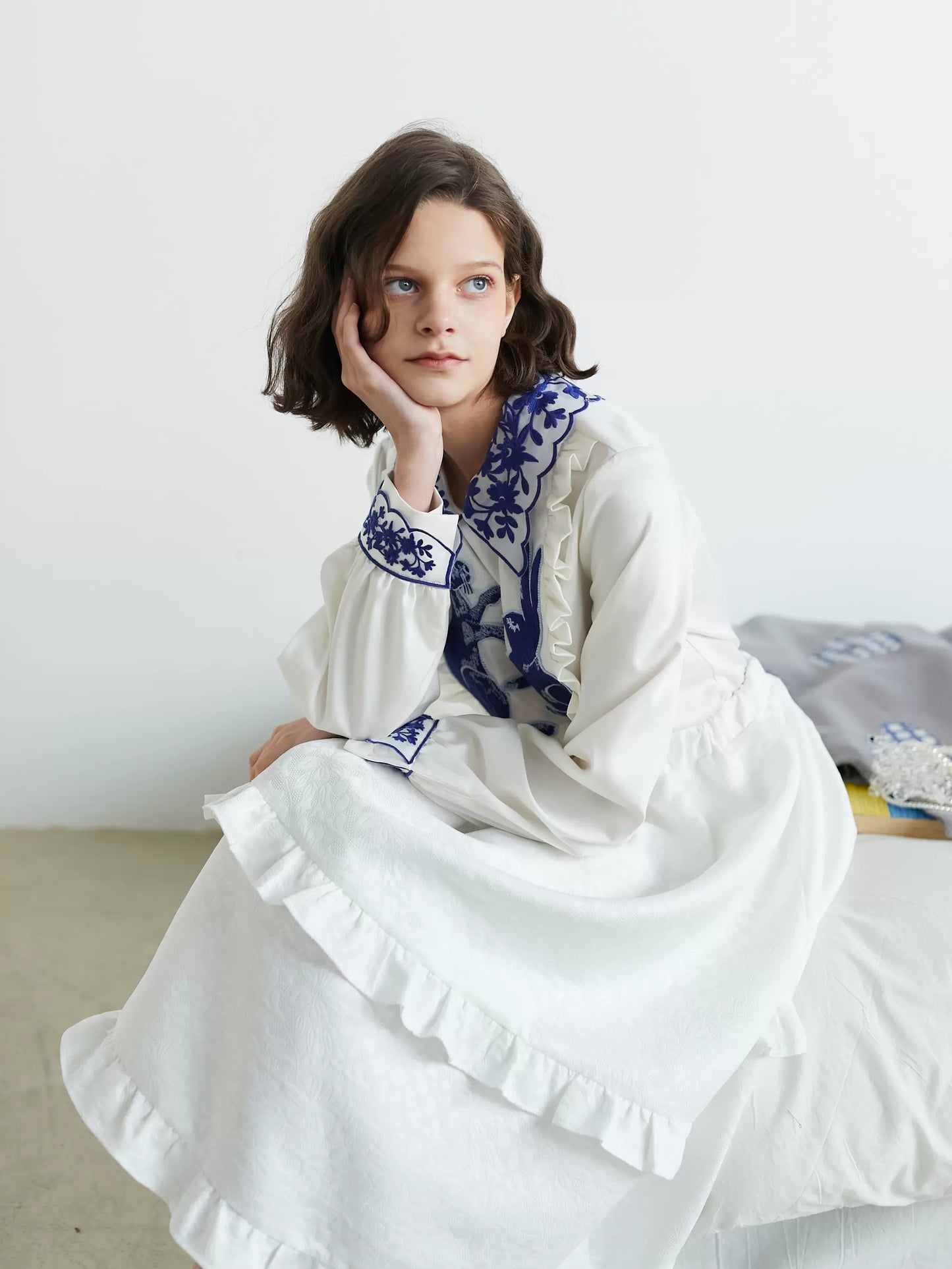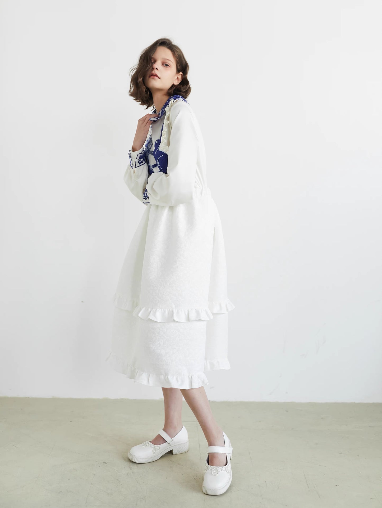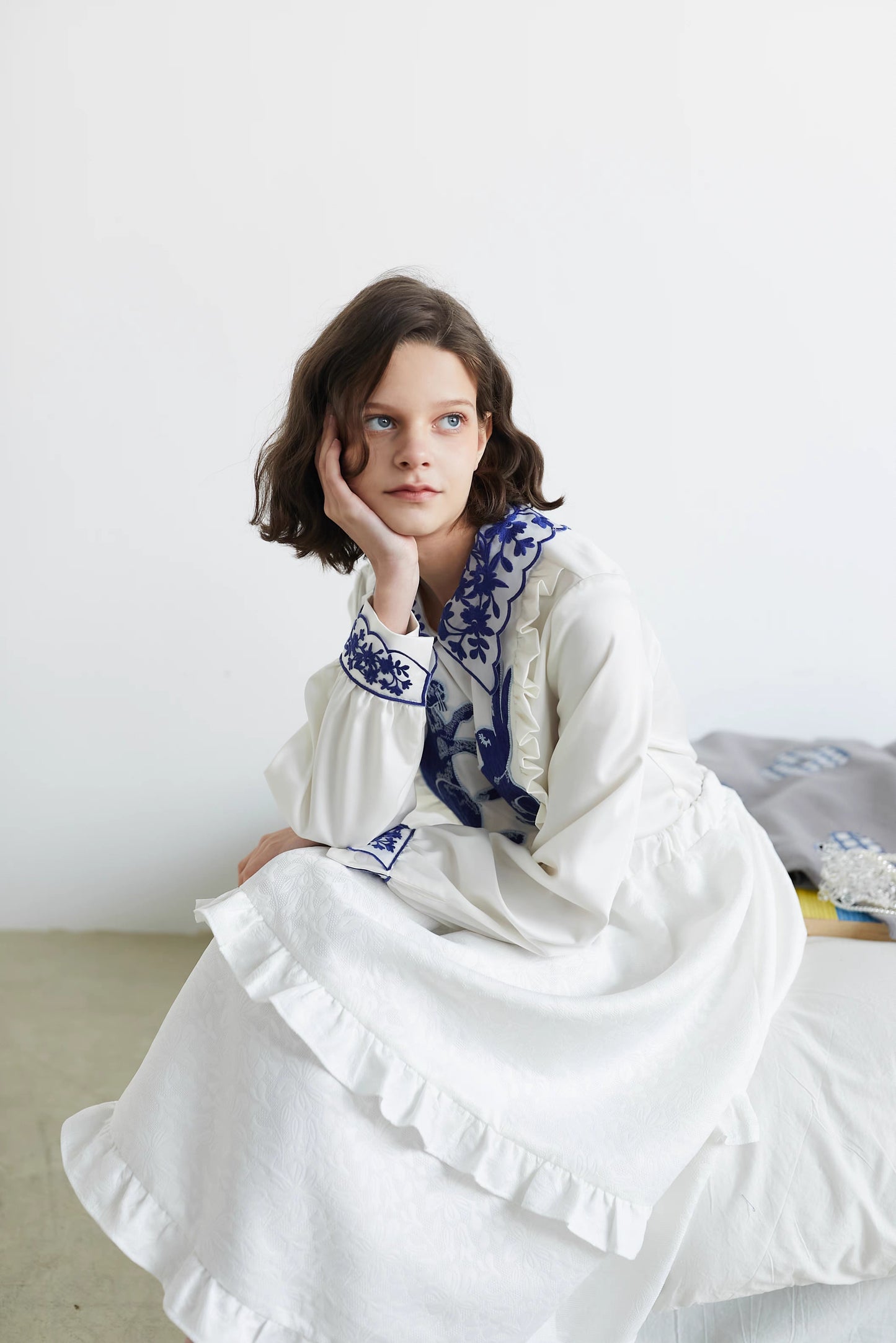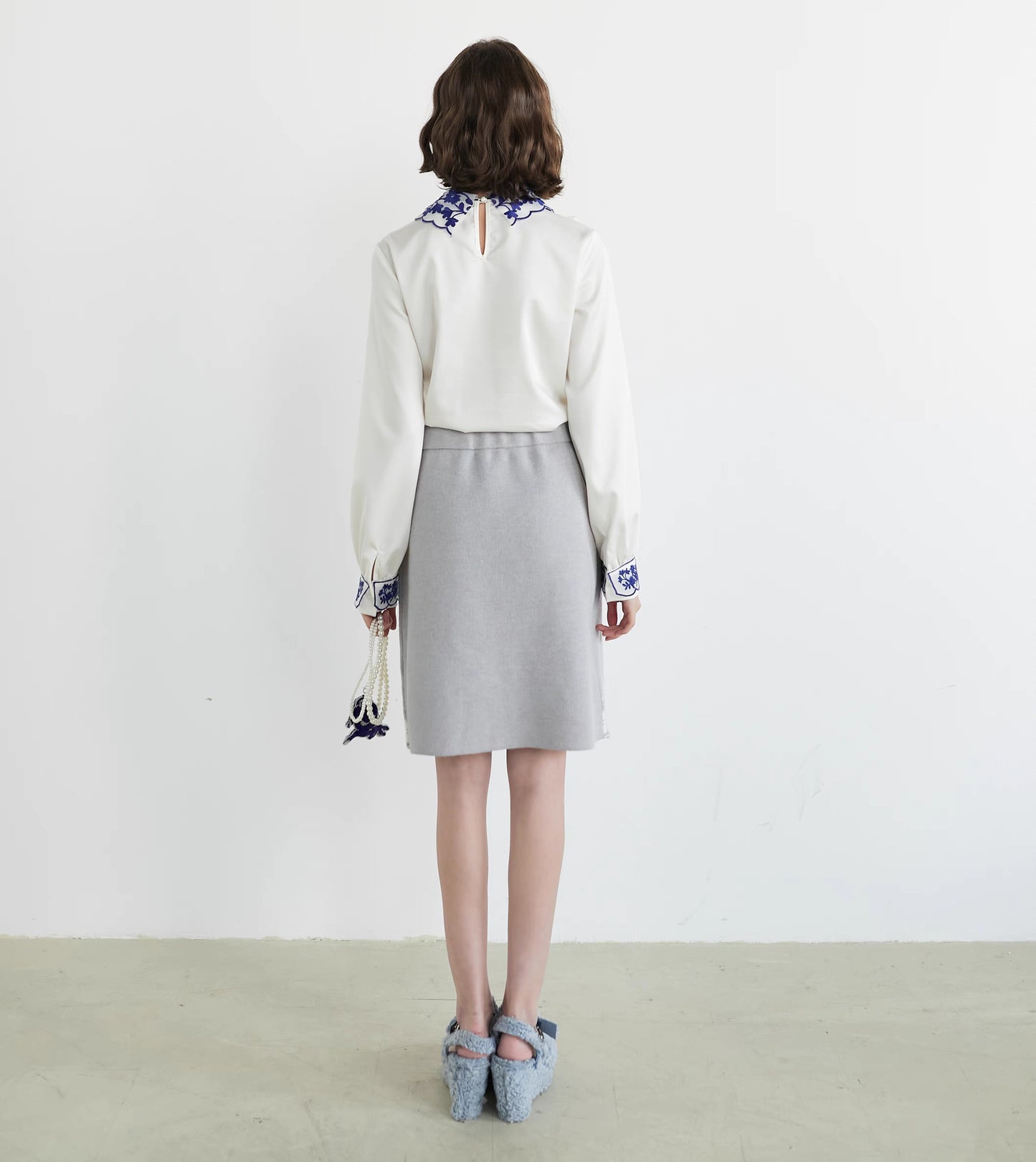 blue and white rabbit shirt embroidered lapel fungus top