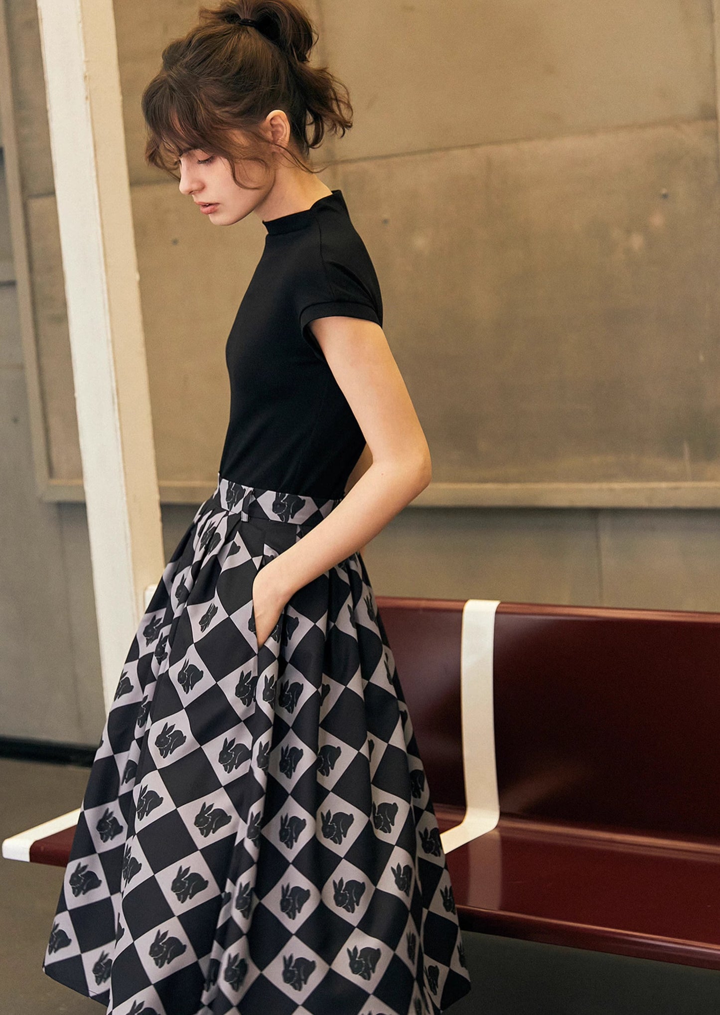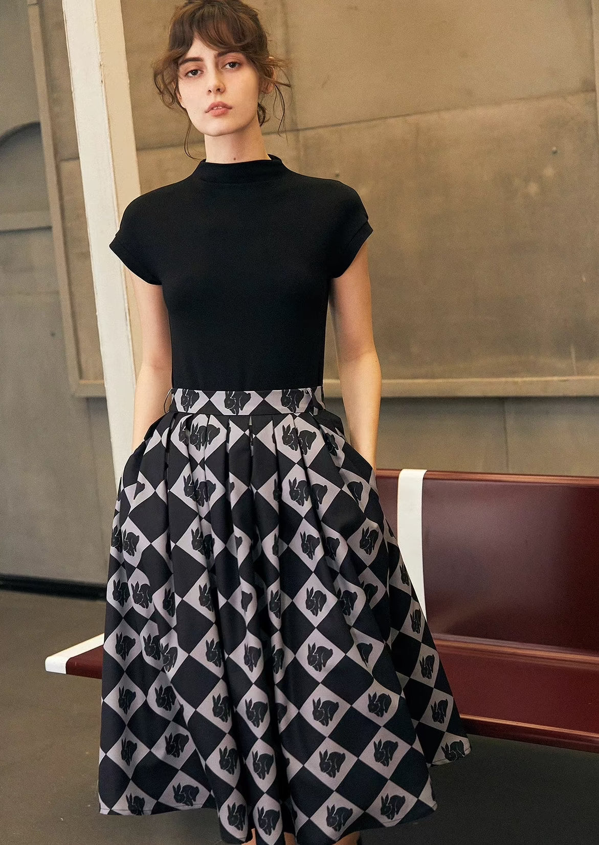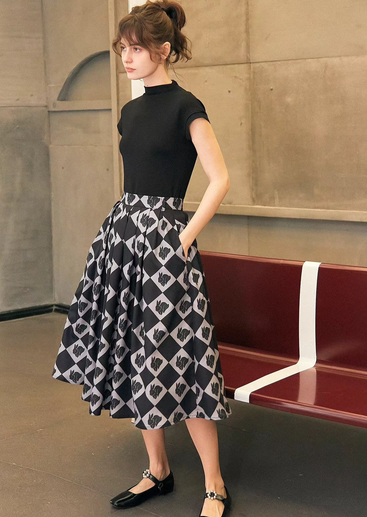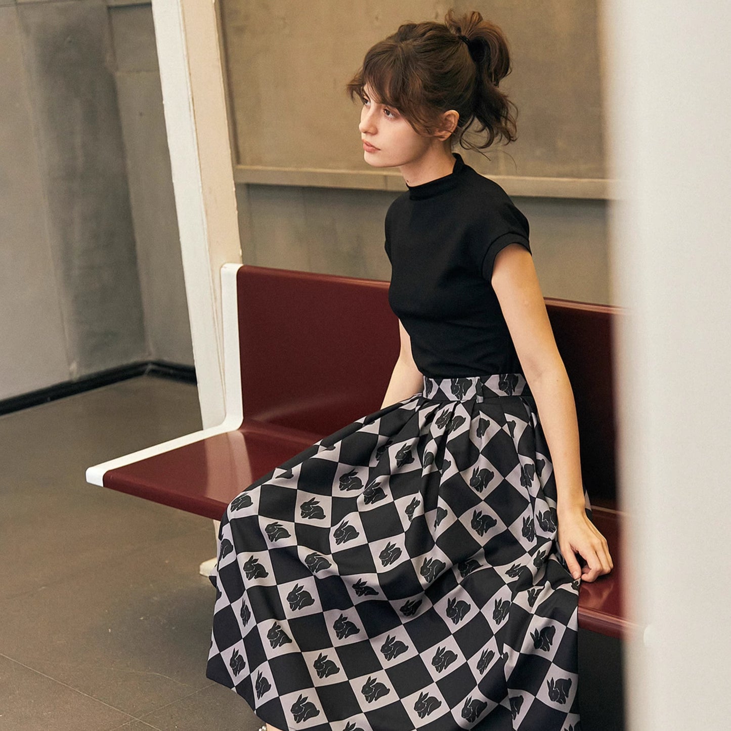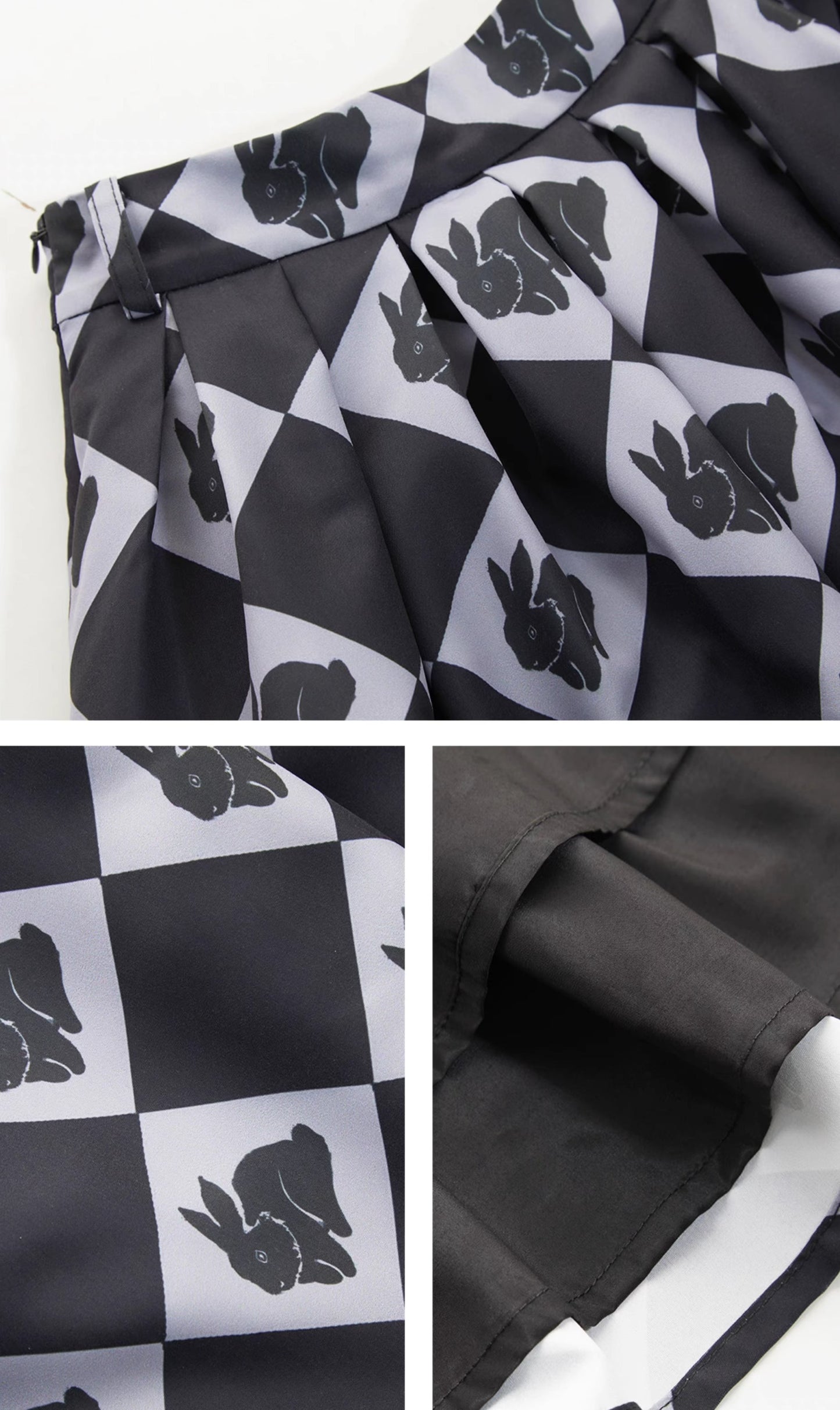 rabbit silhouette retro gray and blue rhombus pleated skirt