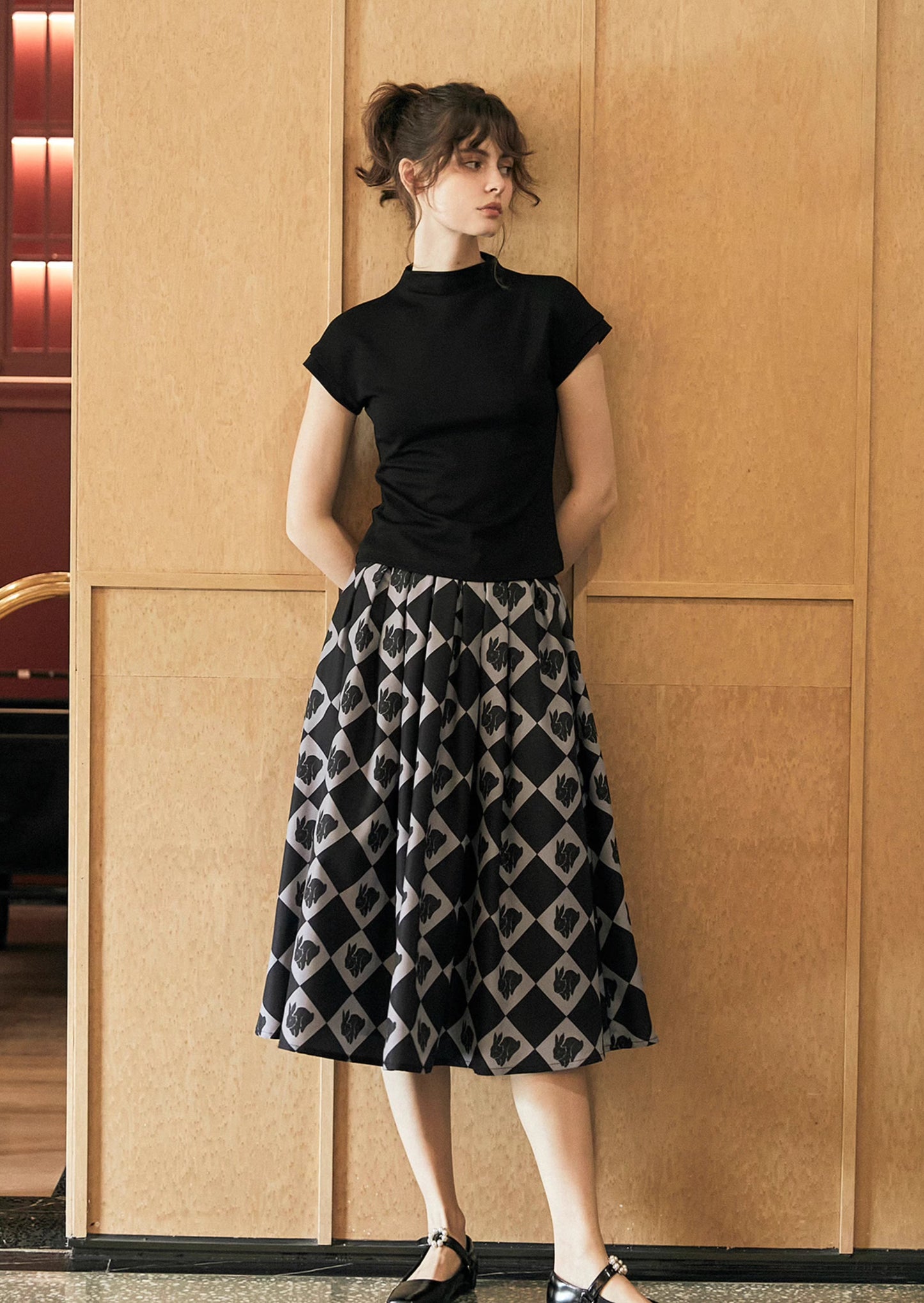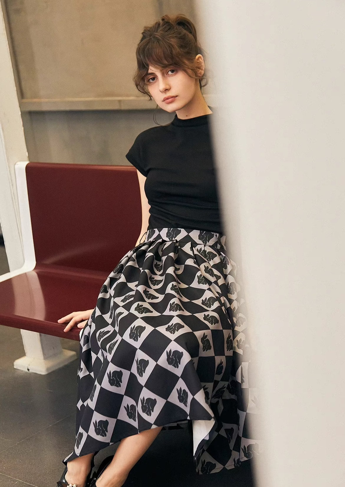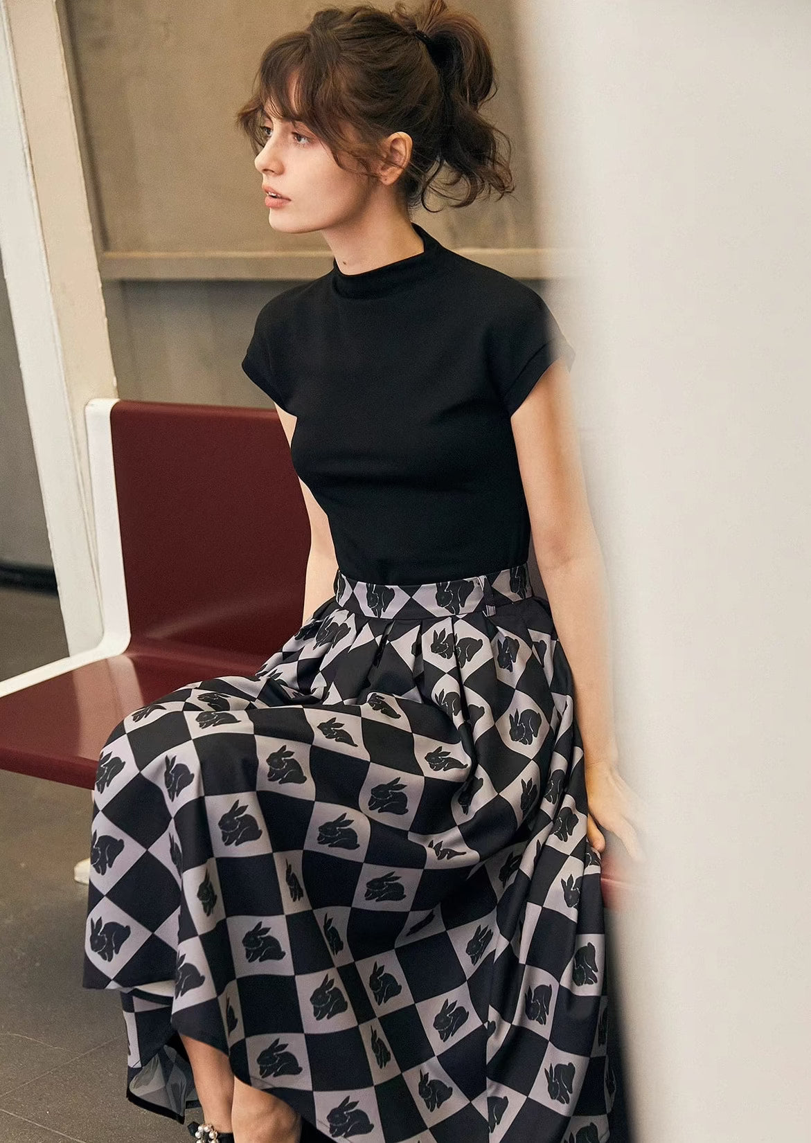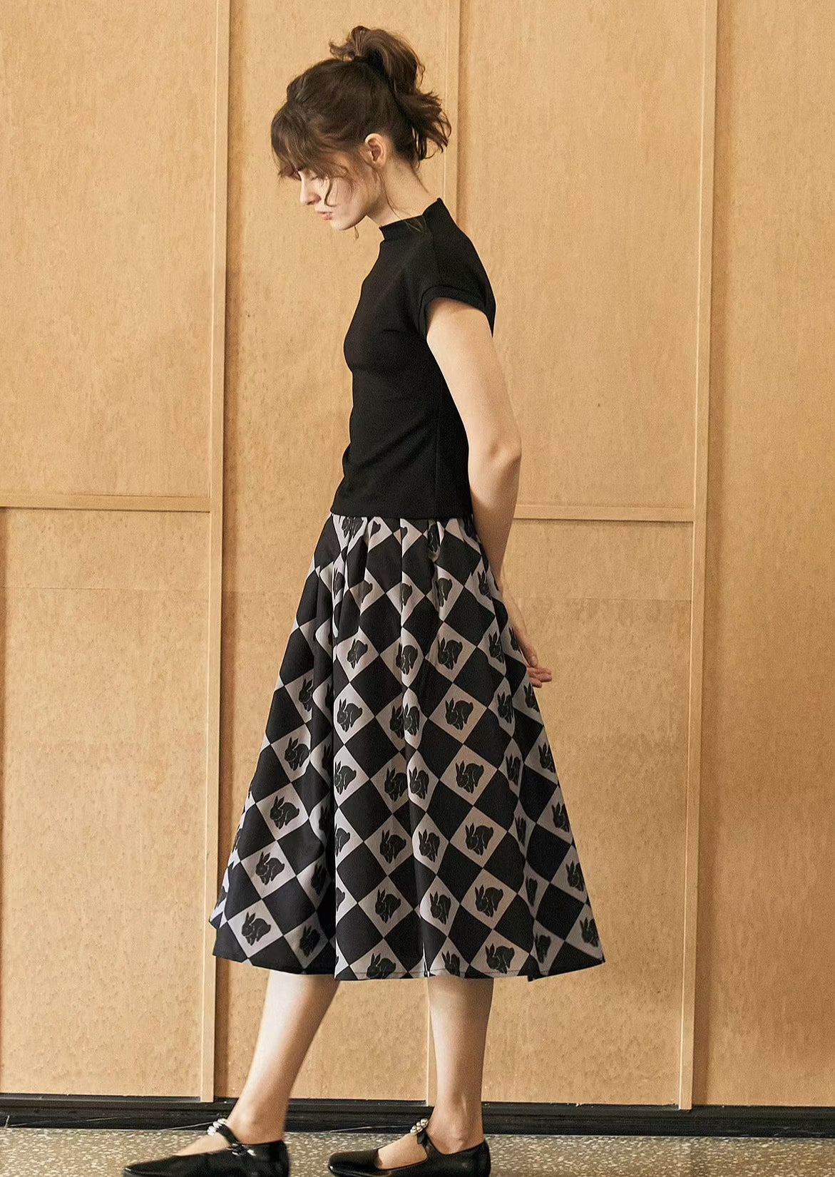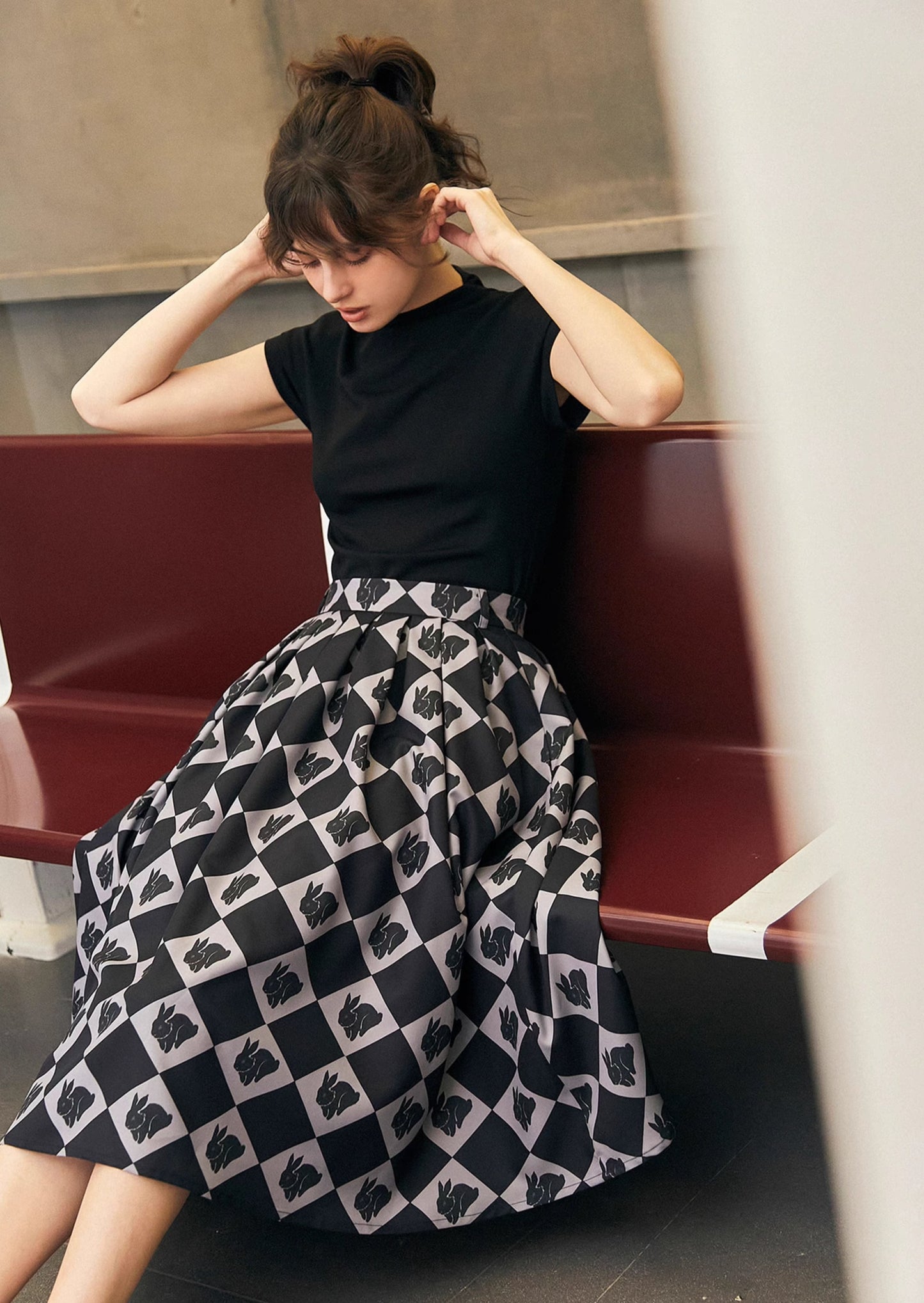 rabbit silhouette retro gray and blue rhombus pleated skirt