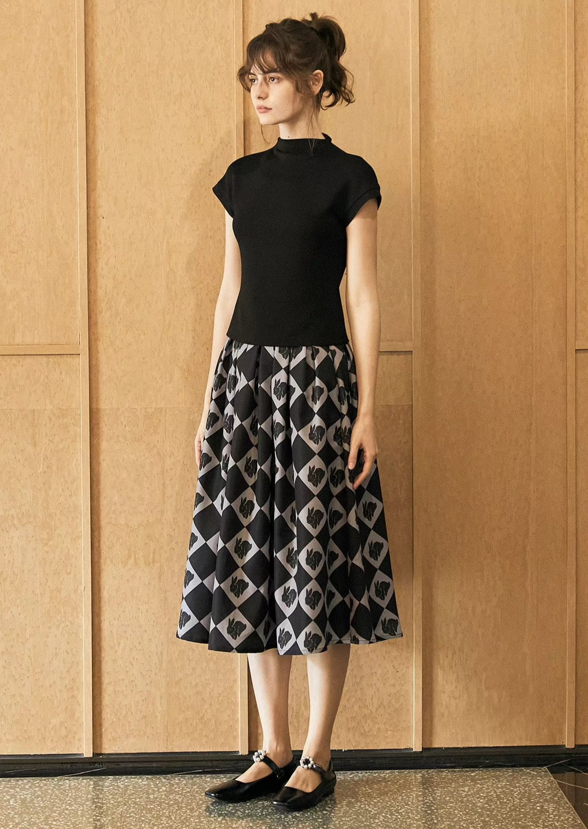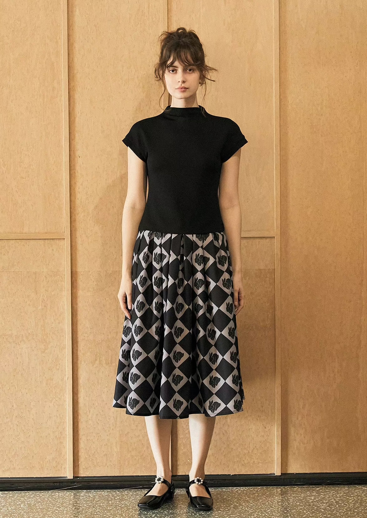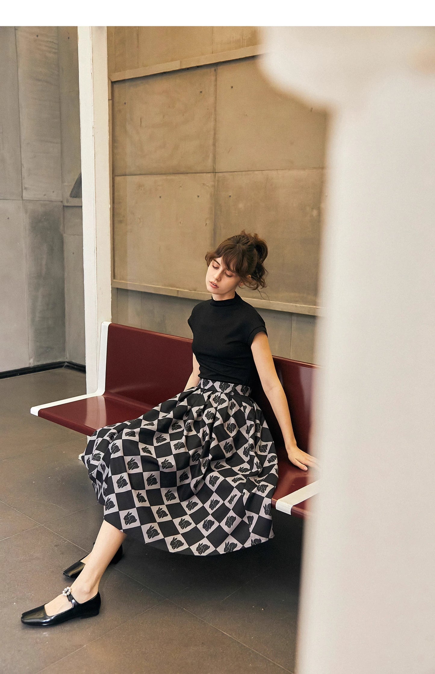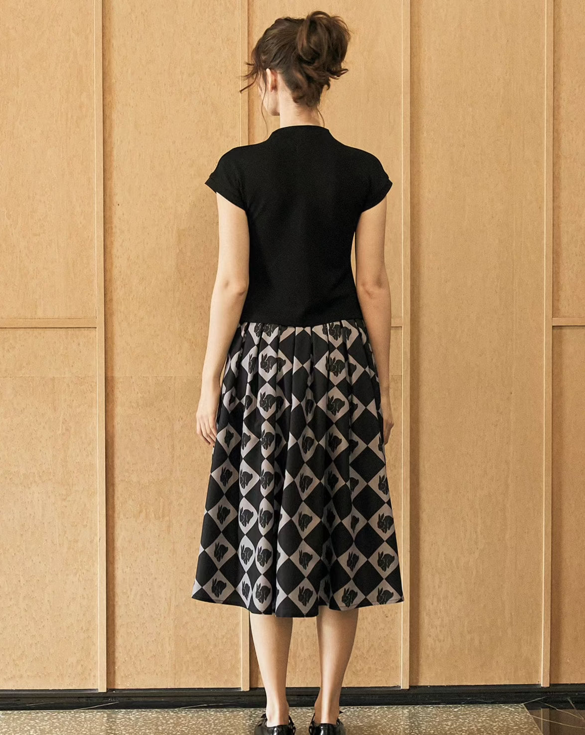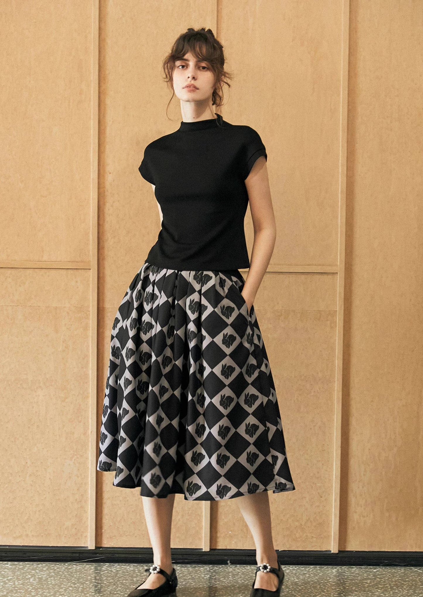 rabbit silhouette retro gray and blue rhombus pleated skirt