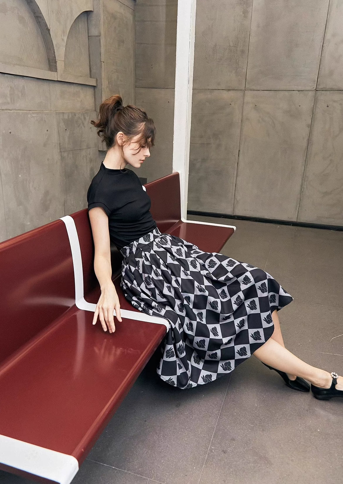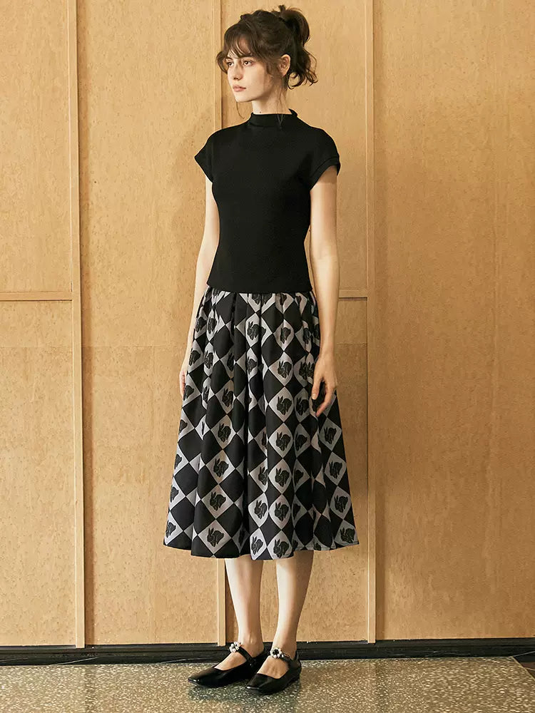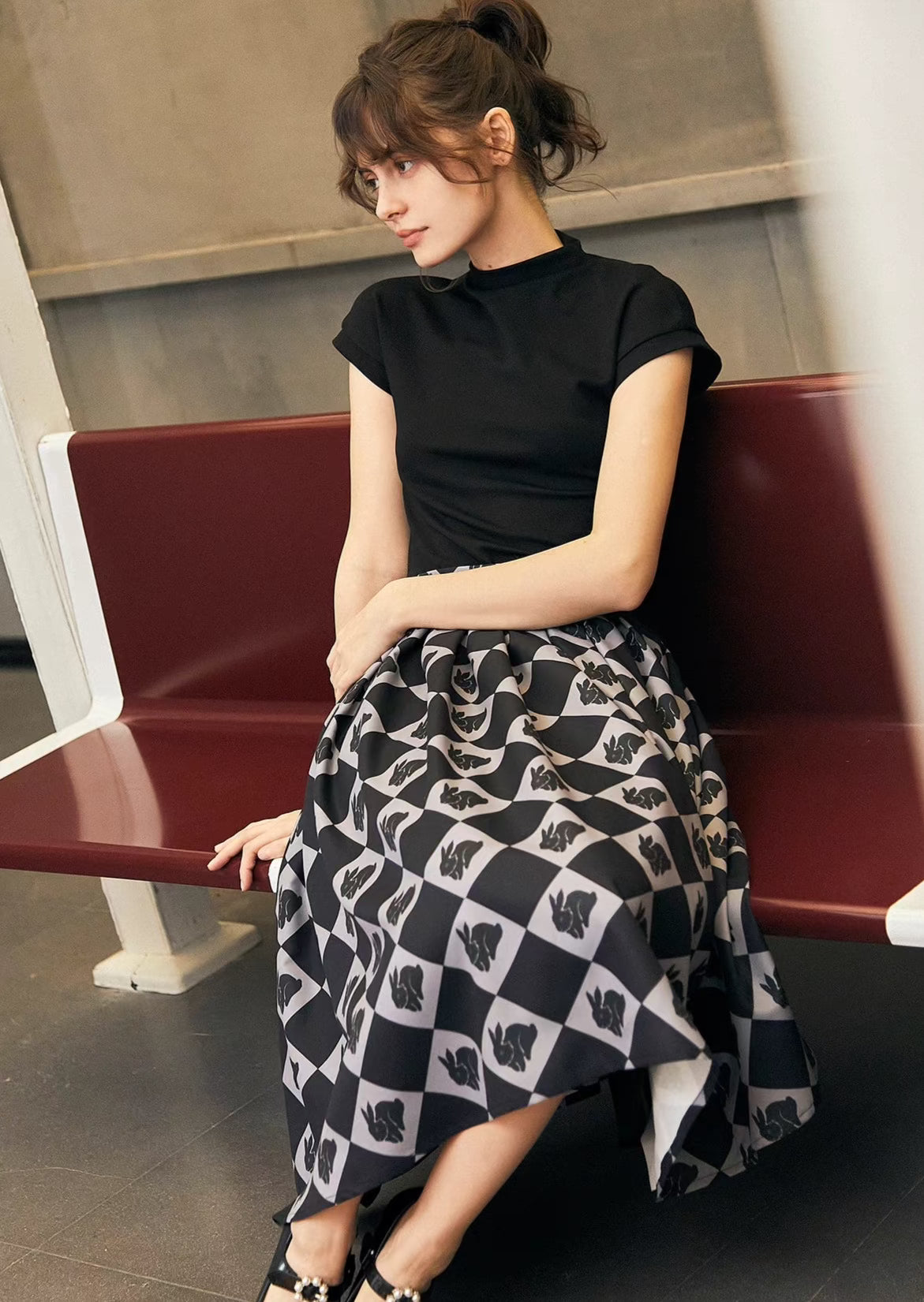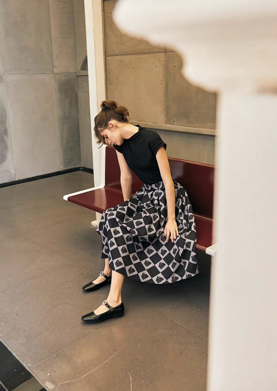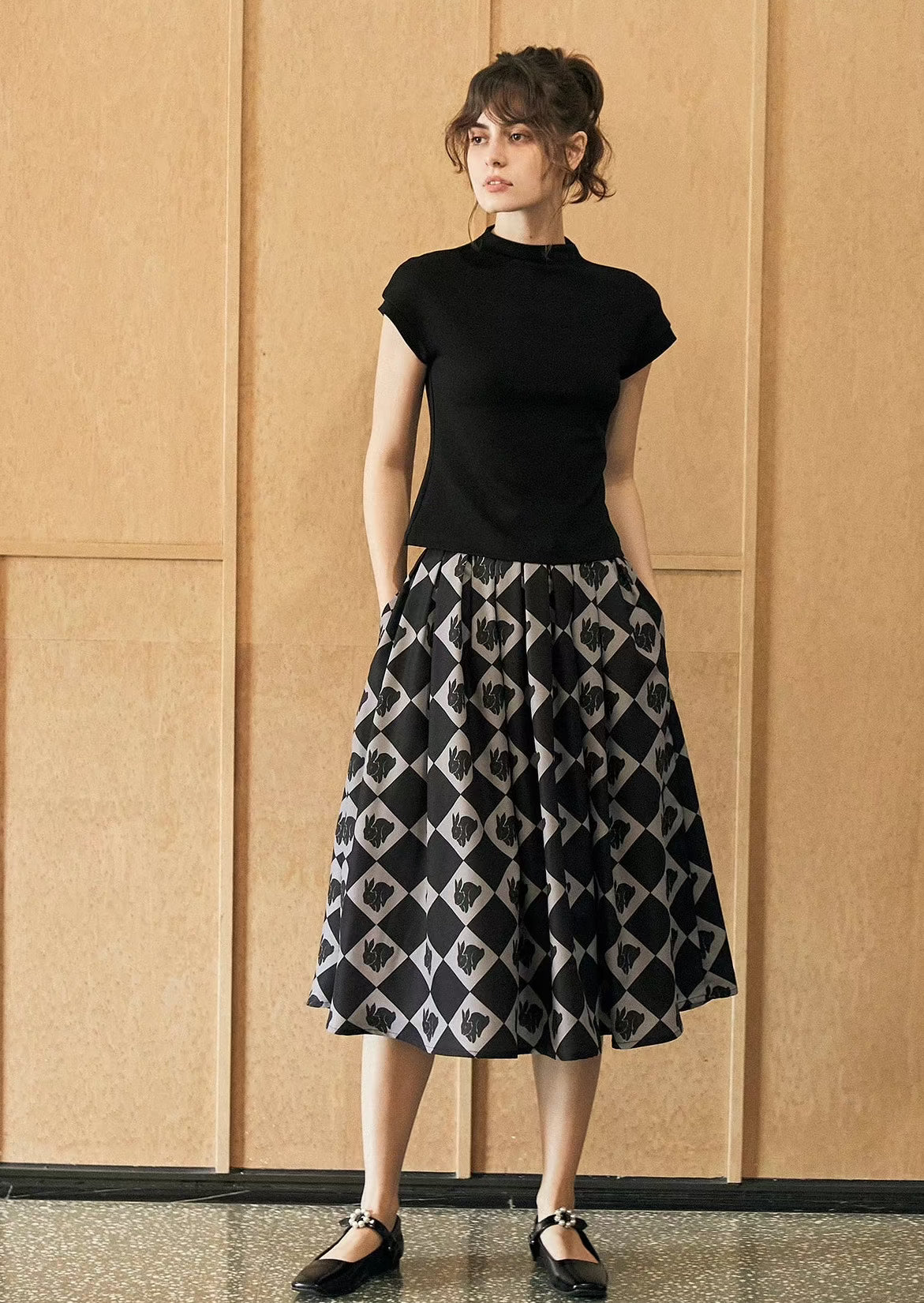 rabbit silhouette retro gray and blue rhombus pleated skirt