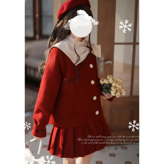 Crimson lady's ribbon jumper skirt, blouse, and cardigan