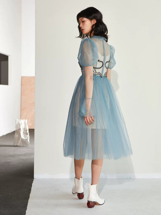 haze blue panther leopard embroidery princess sleeves dress
