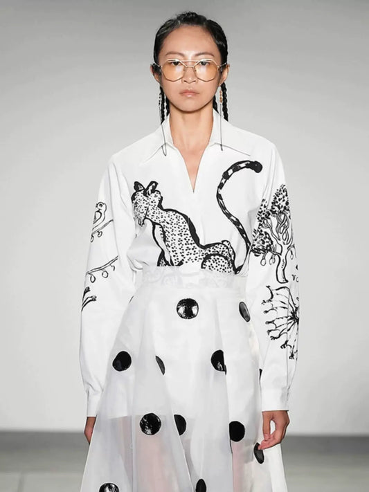 leopard panther print long sleeved black and white shirt