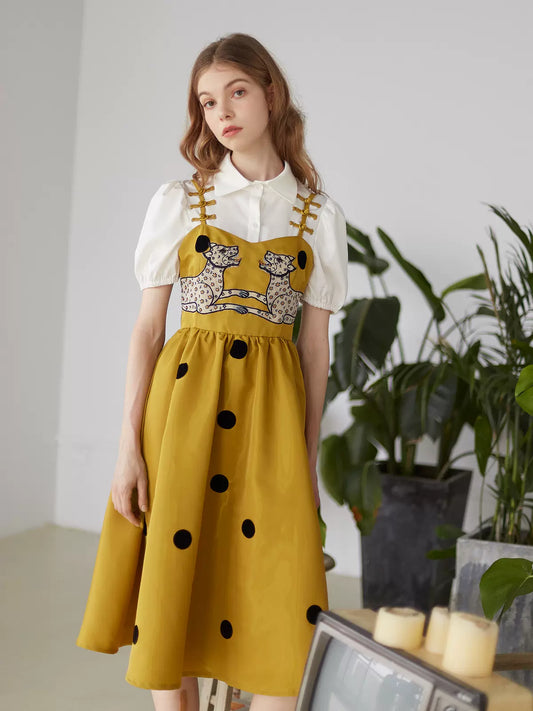 leopard panther embroidery polka dot ginger suspender dress