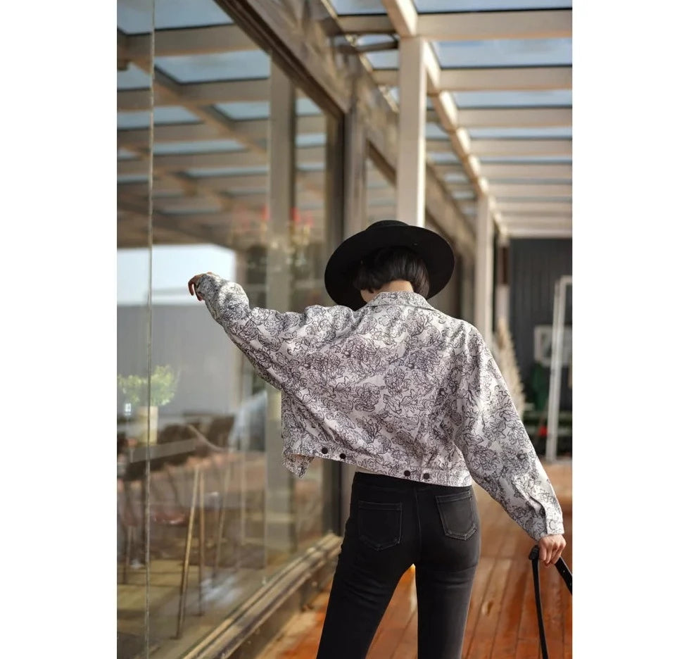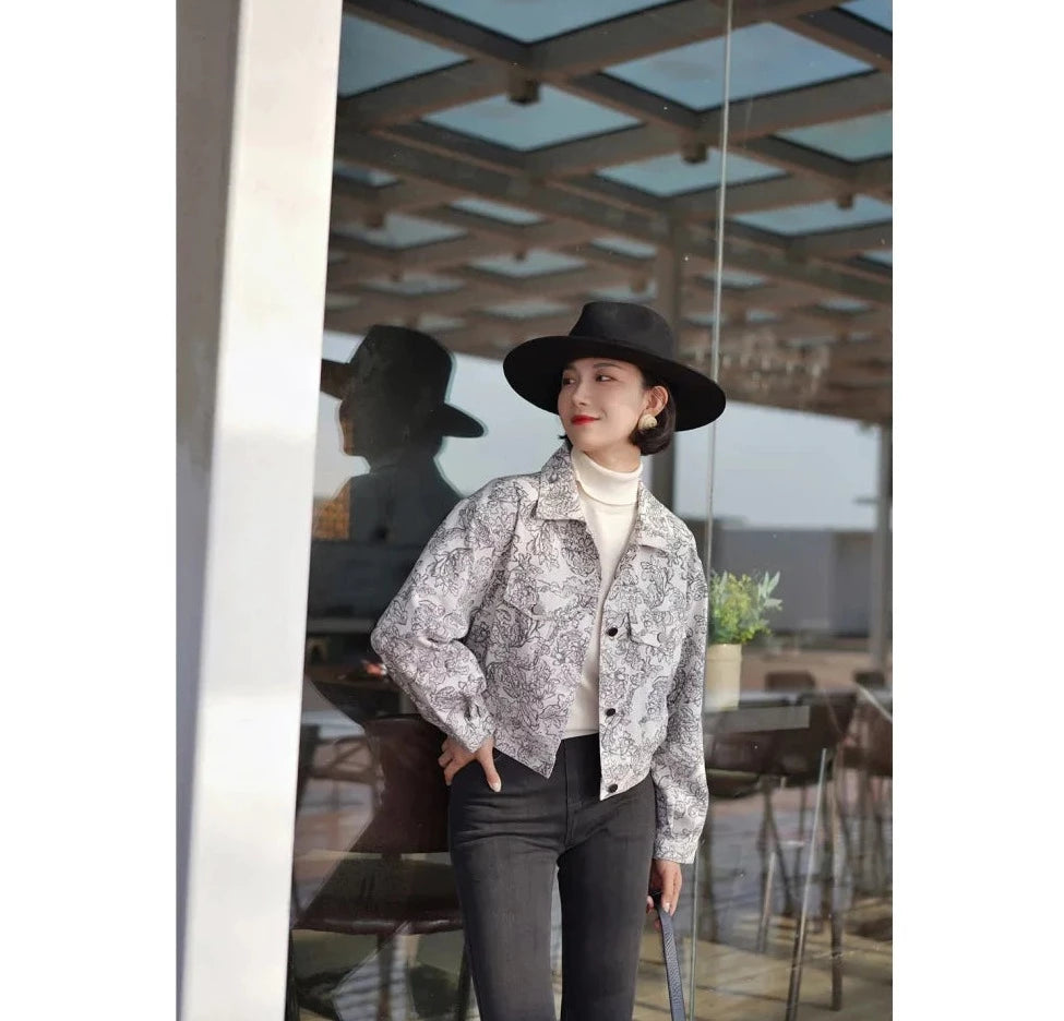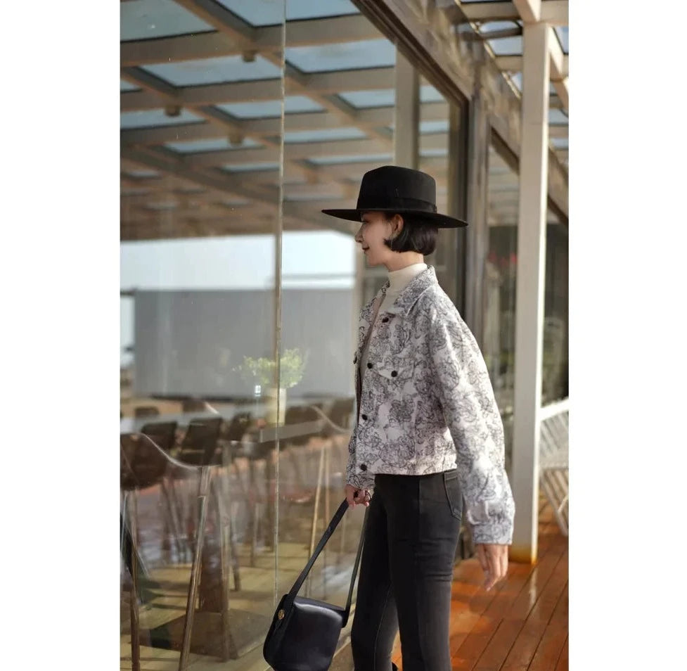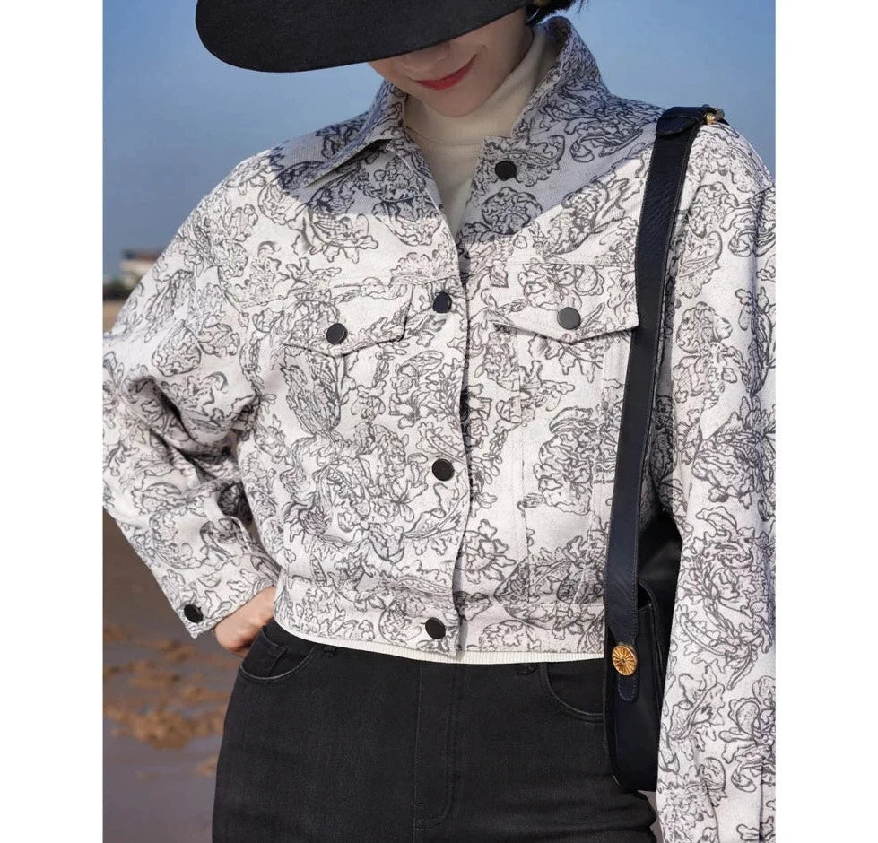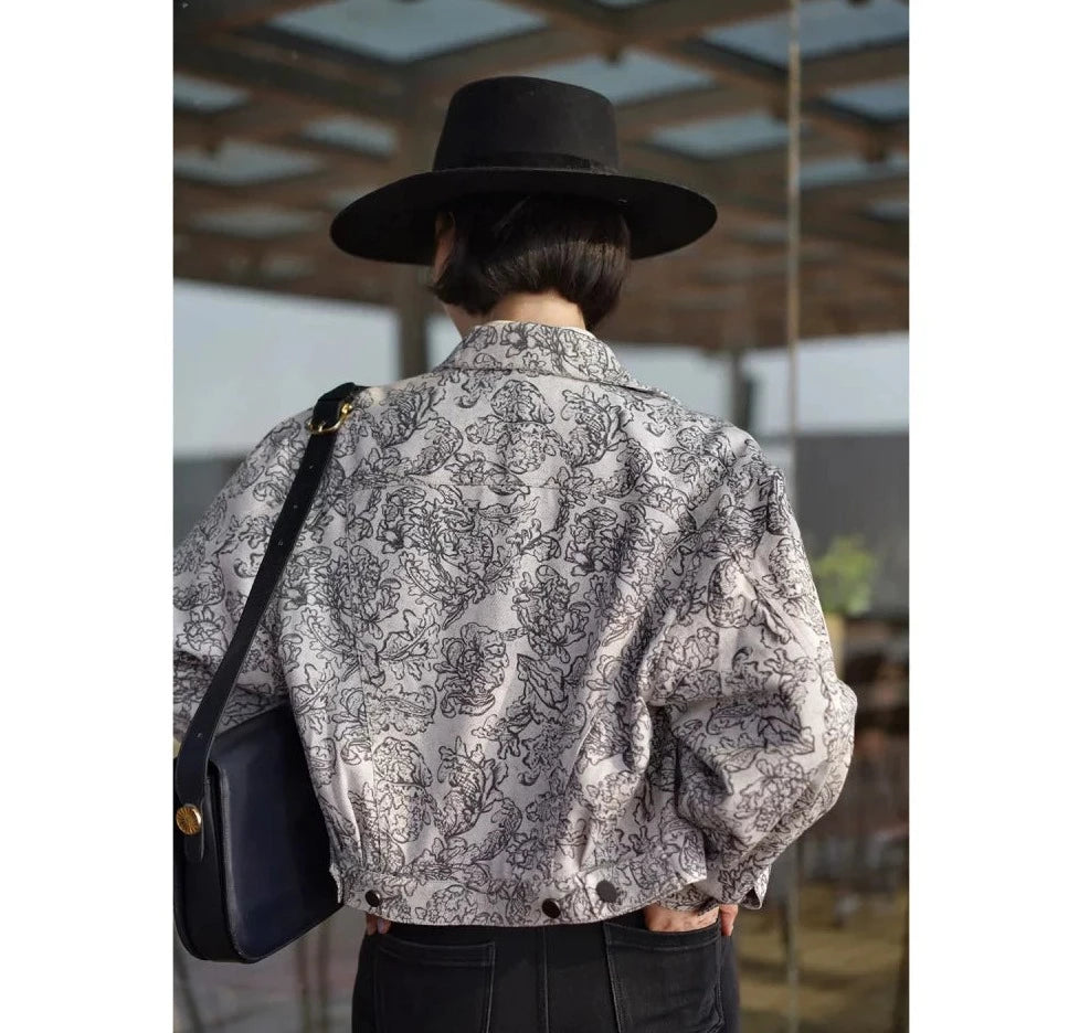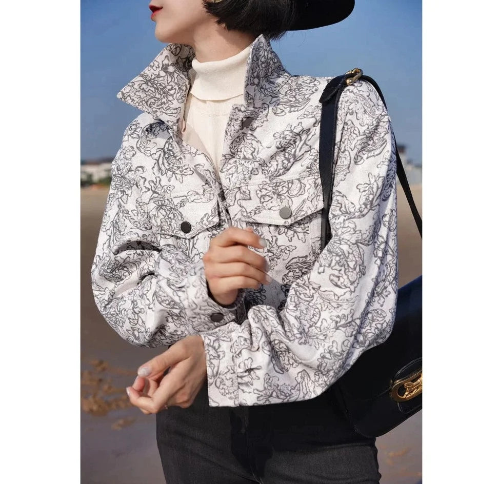 Monochrome plant pattern short jacket