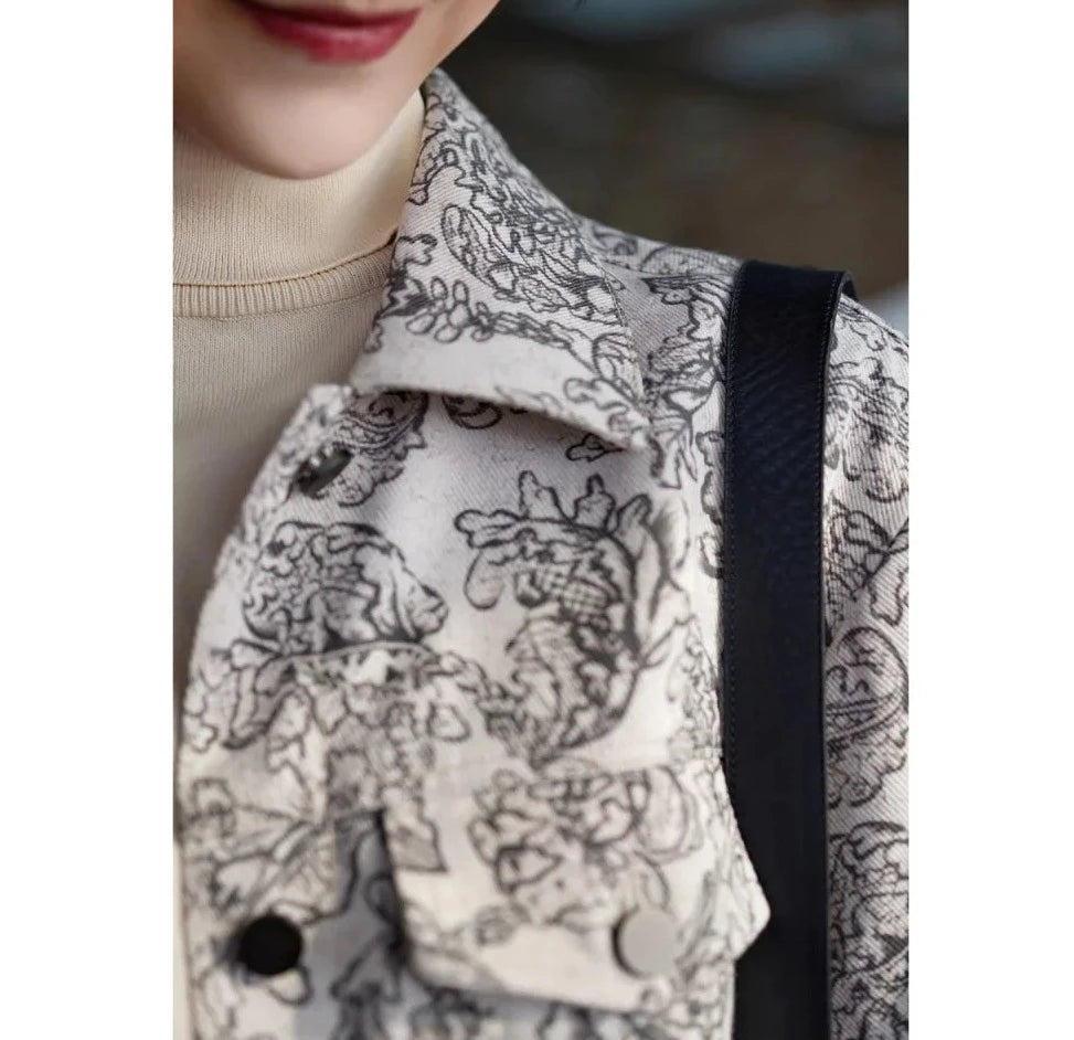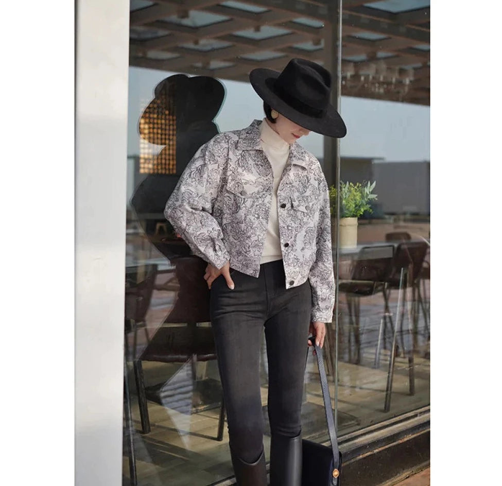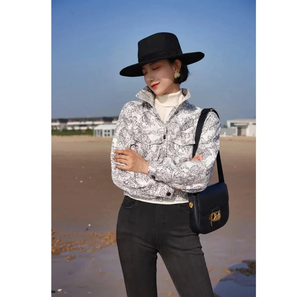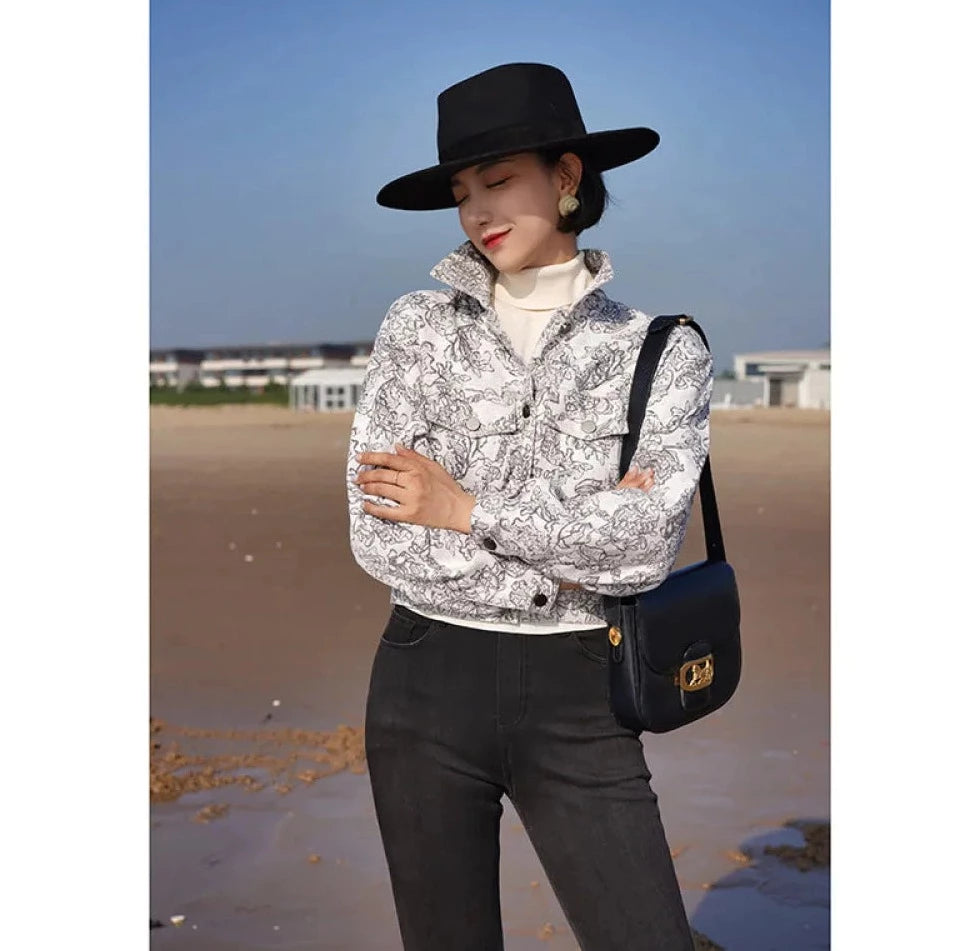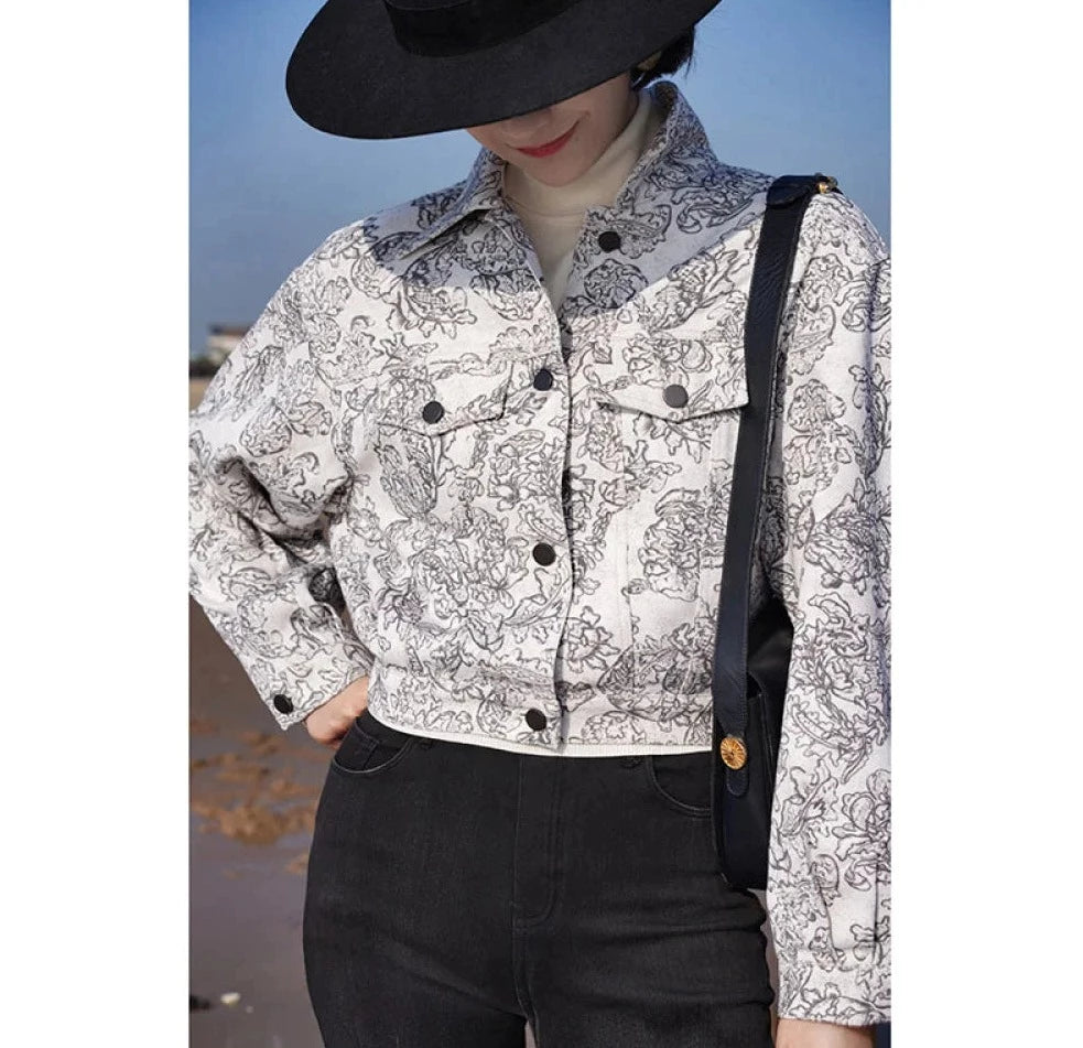 Monochrome plant pattern short jacket