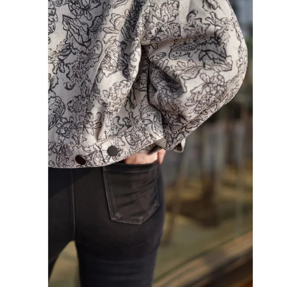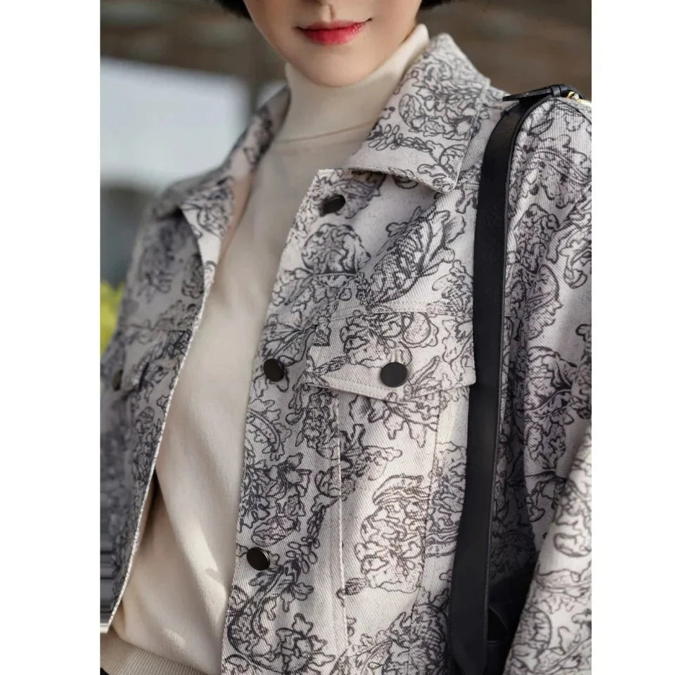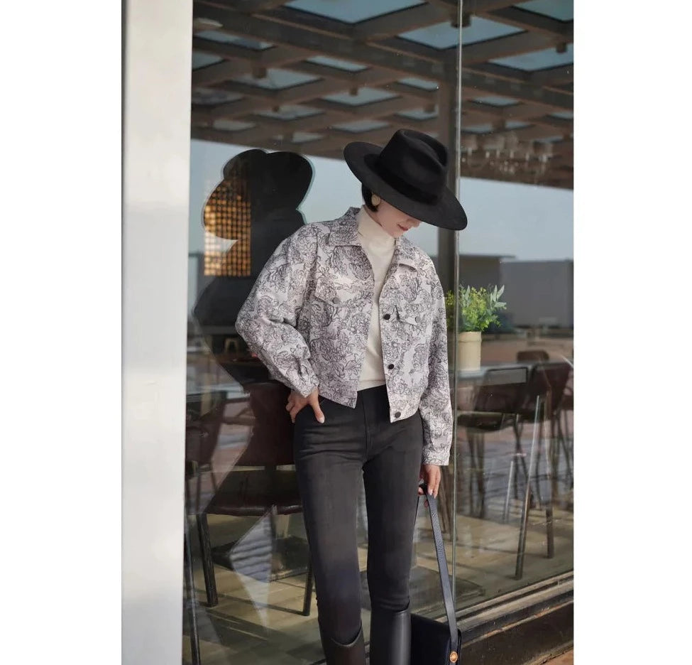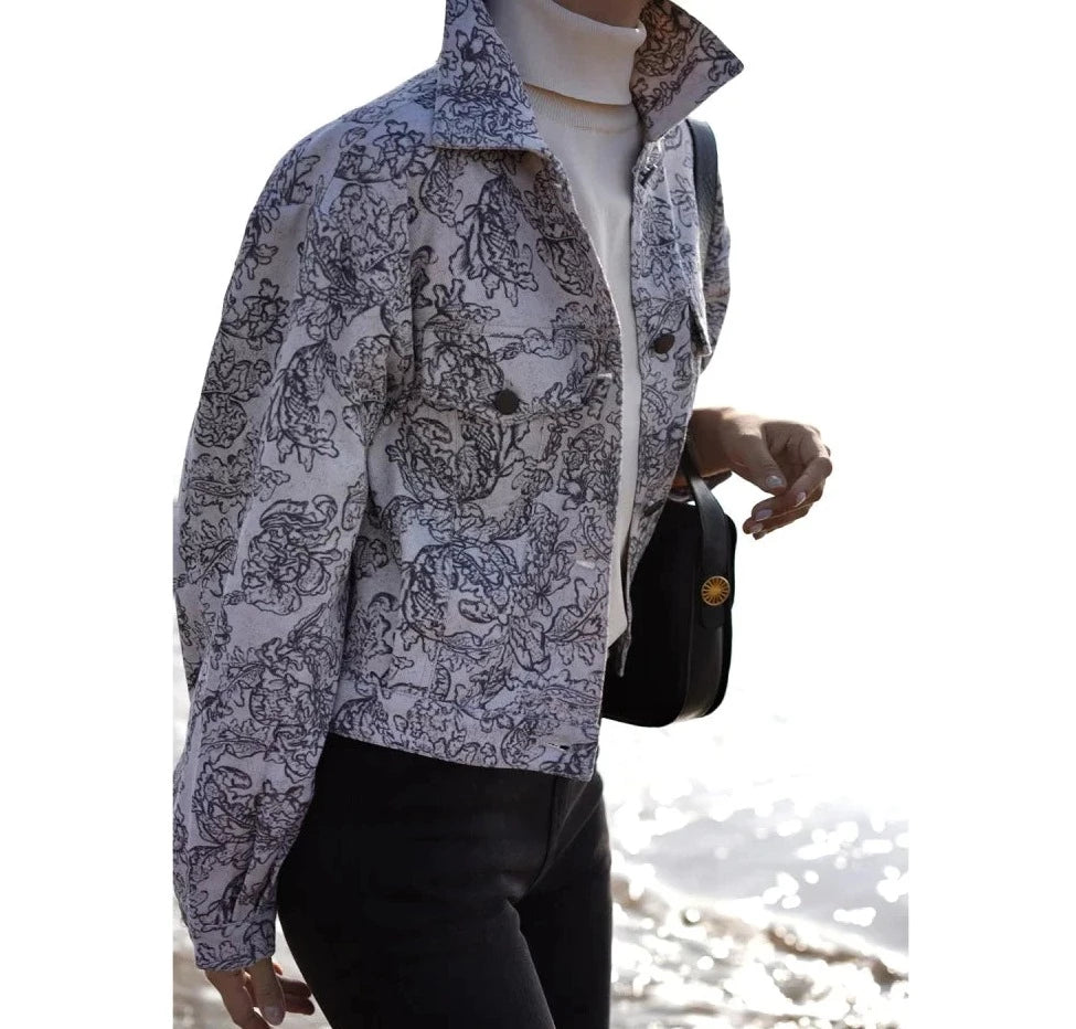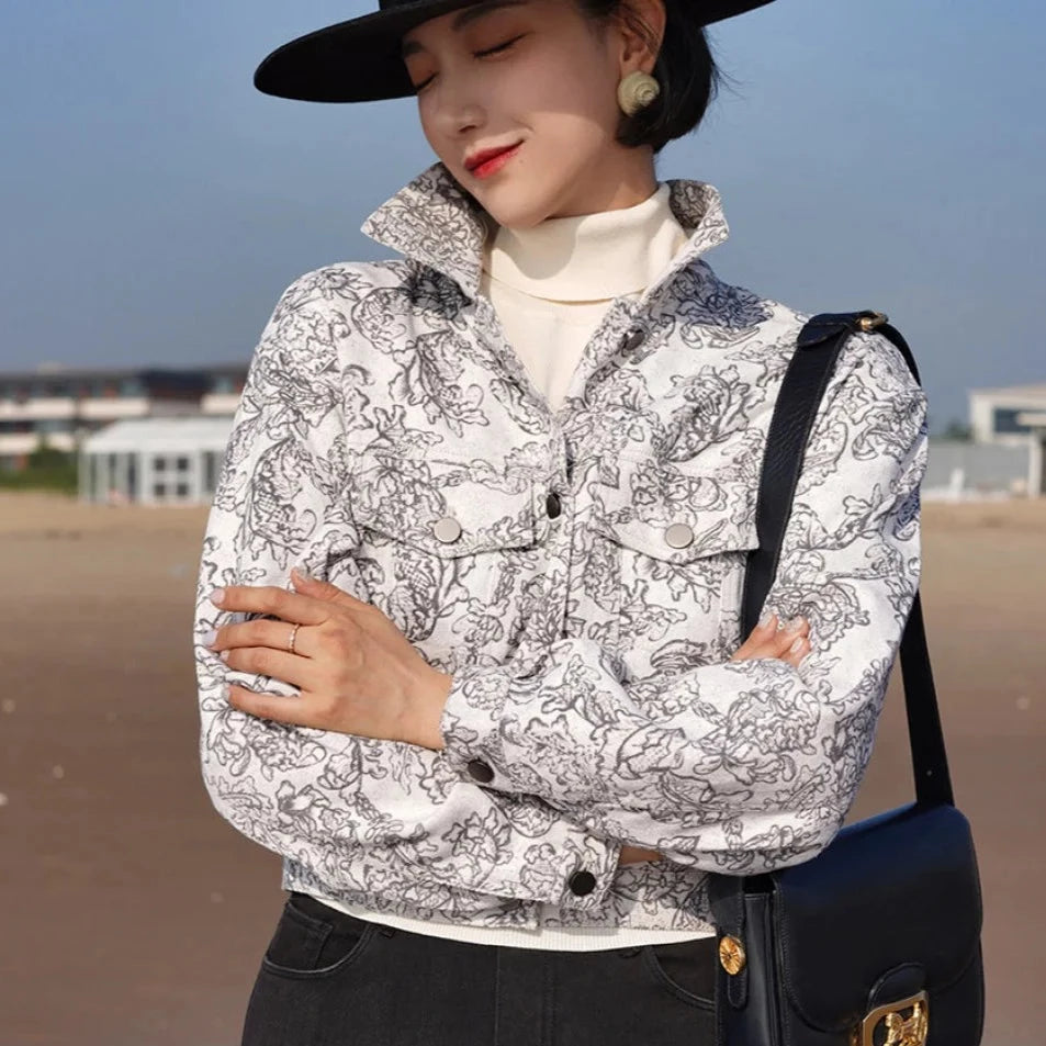 Monochrome plant pattern short jacket