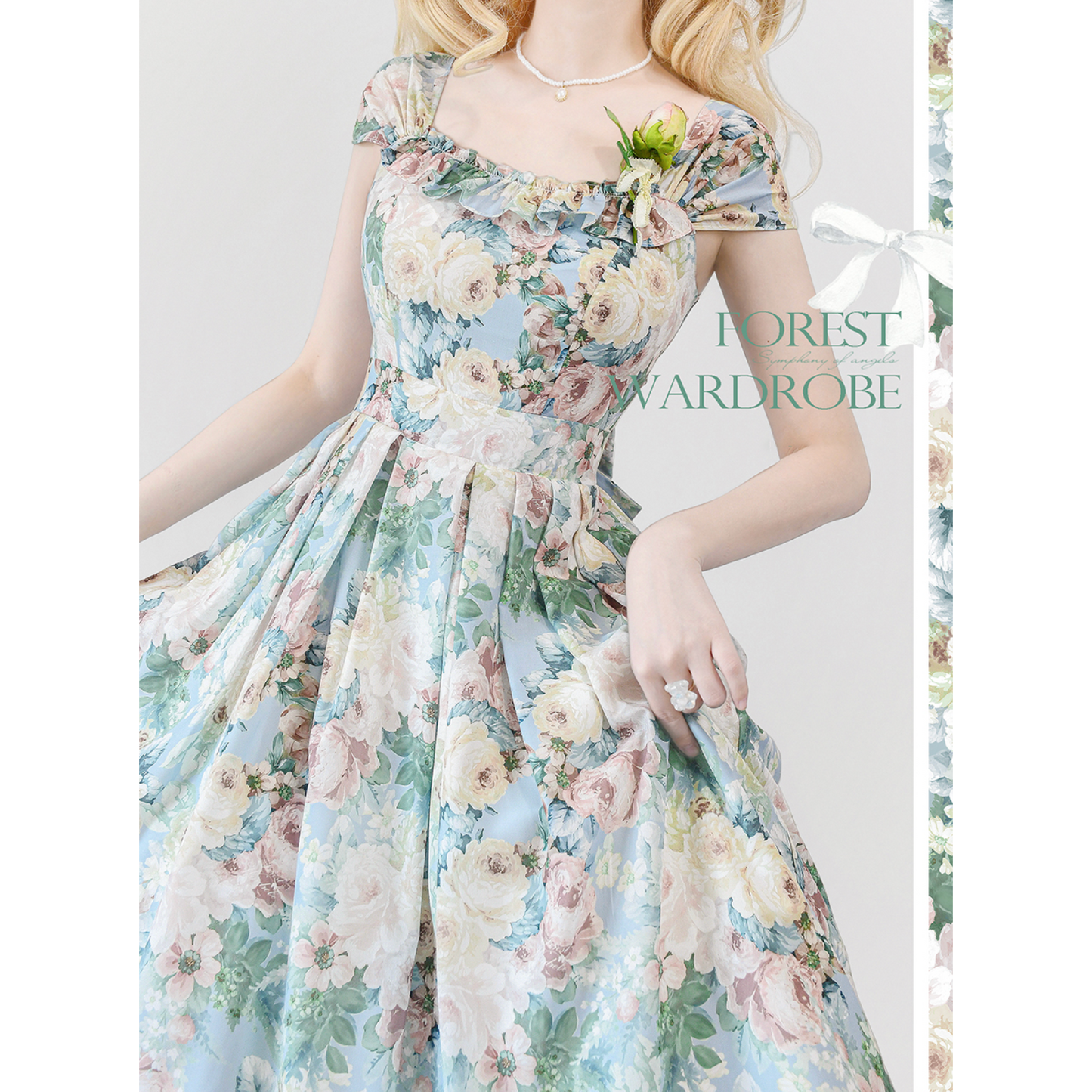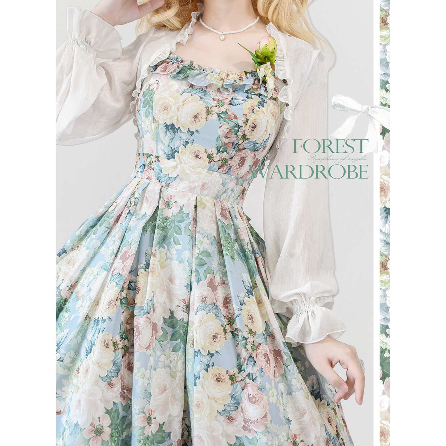 静かな湖の周りに咲く花々を油彩画で描いたワンピースとボレロカーディガン。