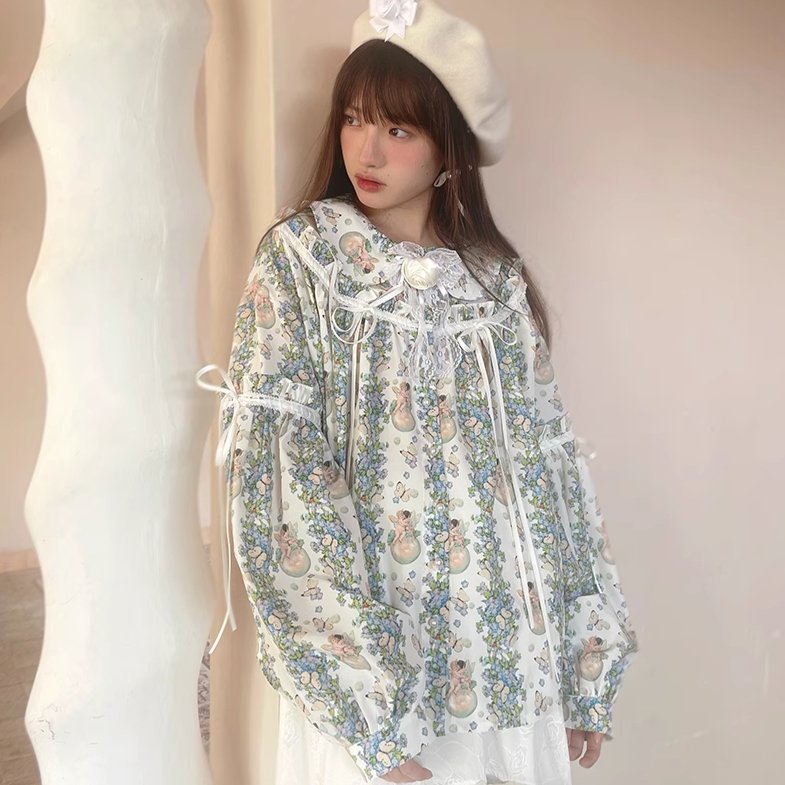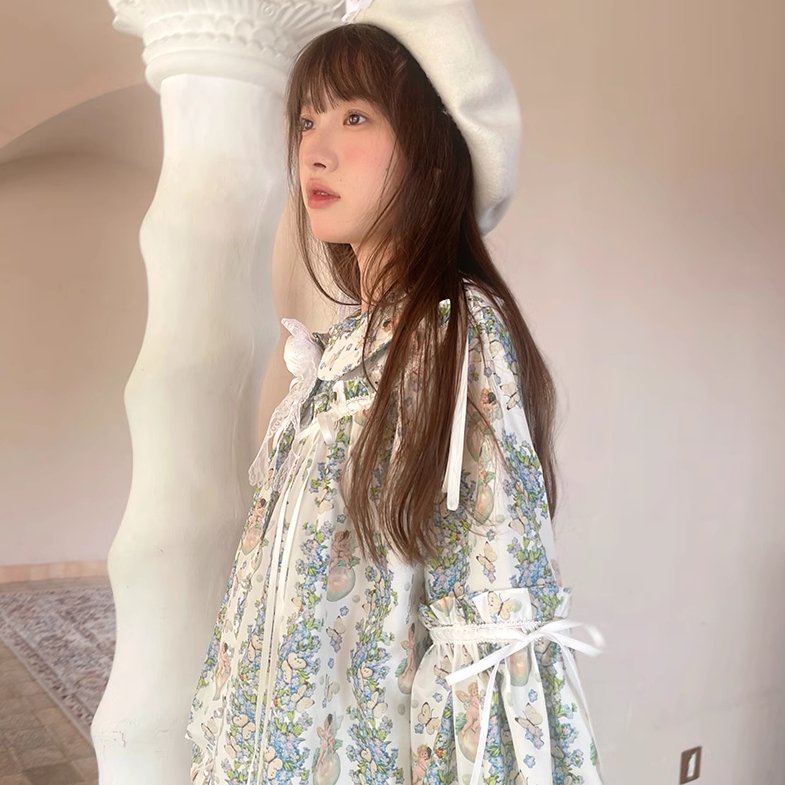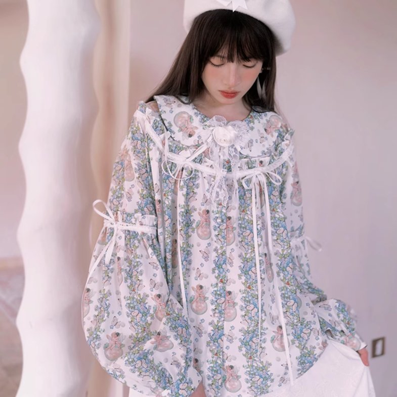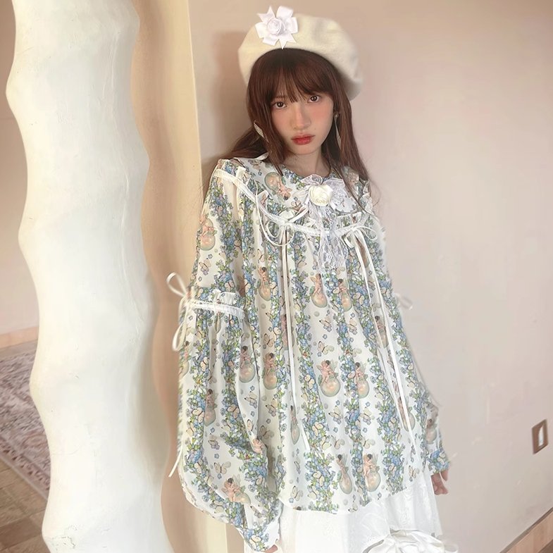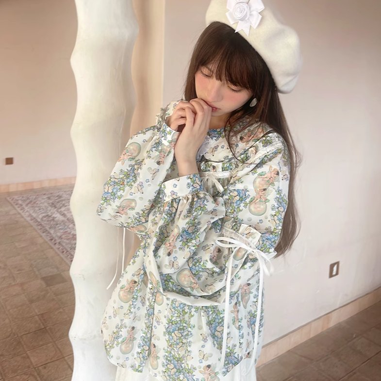 Angel Print Puff Sleeve Loose Shirt