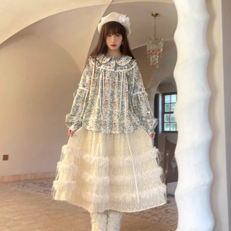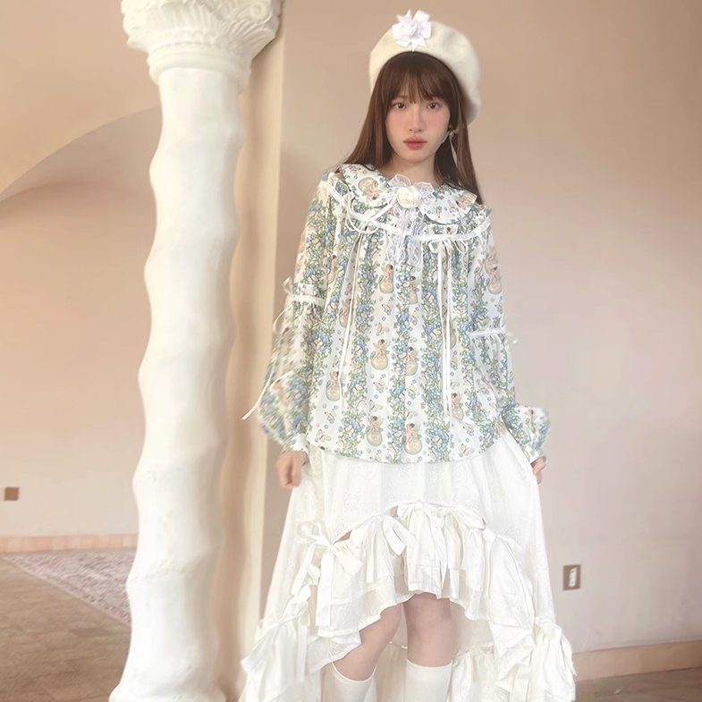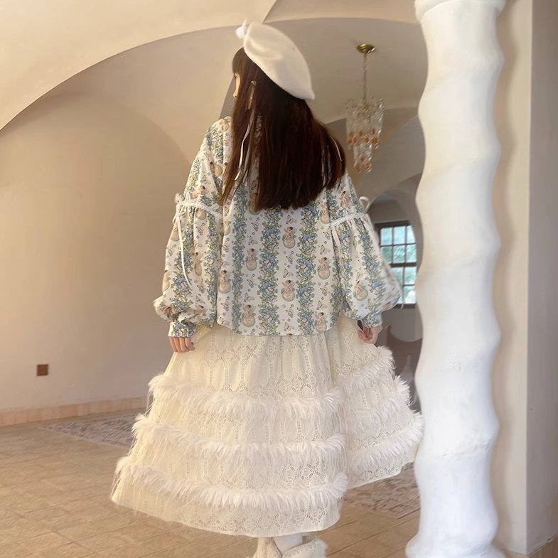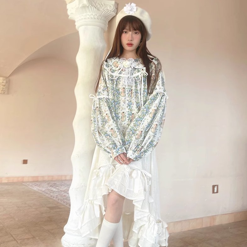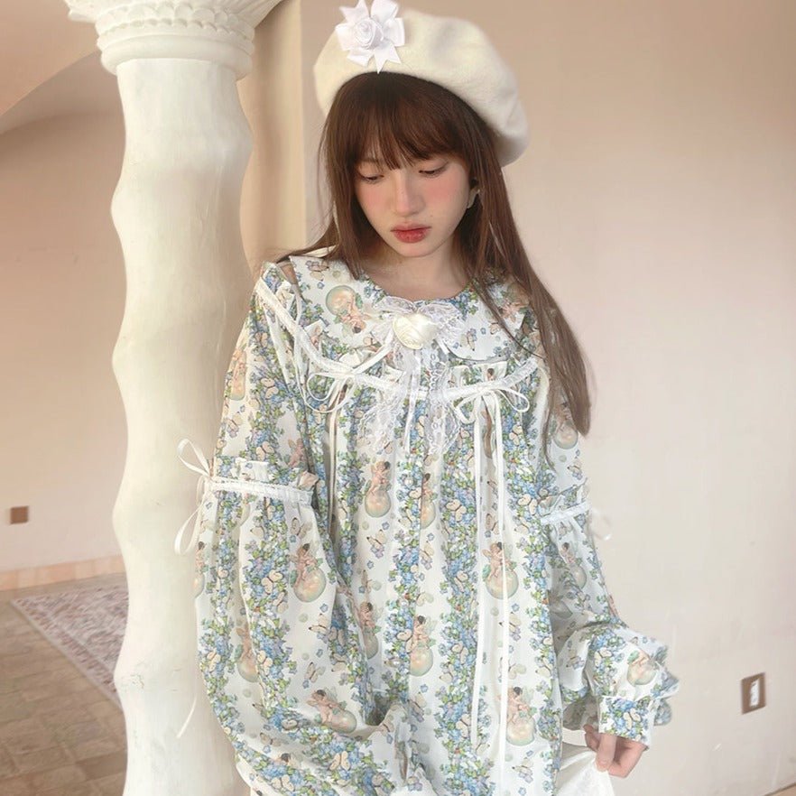 Angel Print Puff Sleeve Loose Shirt